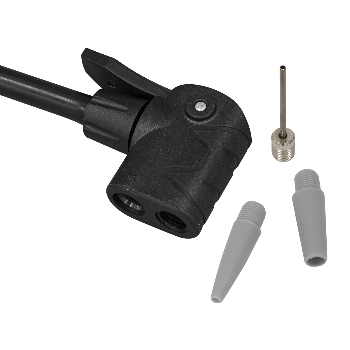 19.16 2025-12-02Durable construction with chrome plated steel upright tube. Dial type high pressure gauge with rotating bezel. Gauge calibrated in psi and bar with ranges from 0-8bar and 0-120psi. Fitted with twin head for both Presta and Schrader valves and a 360° rotatable hose. Features a wide base for added stability with foot stand. Supplied with accessories for inflating items such as small inflatable boats, air beds and balls stored in a compartment located in the handle.