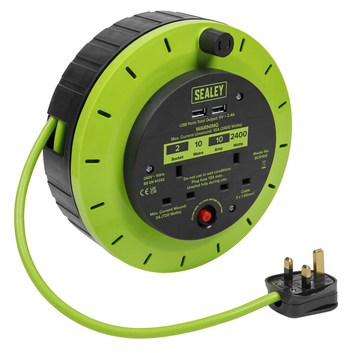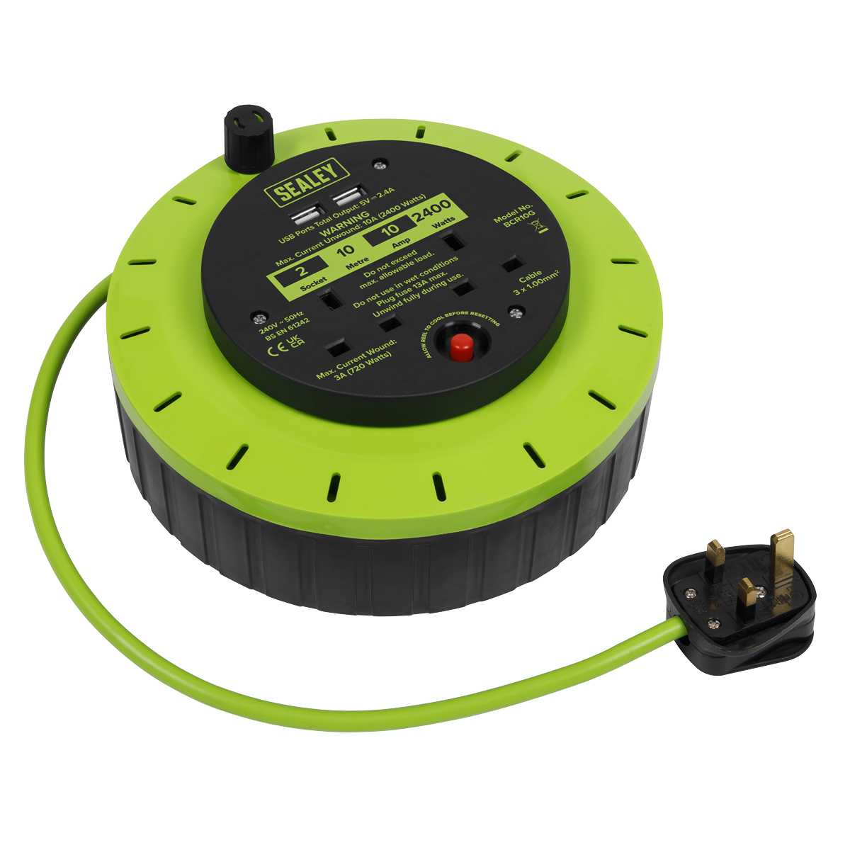 33.68 2025-11-01Composite reel with fully enclosed cable. Fitted with 3-pin plug and thermal trip. 10m 3 x 1mm² PVC cable. 2 x 230V Power sockets and 2 x USB Ports. Built-in carry handle.