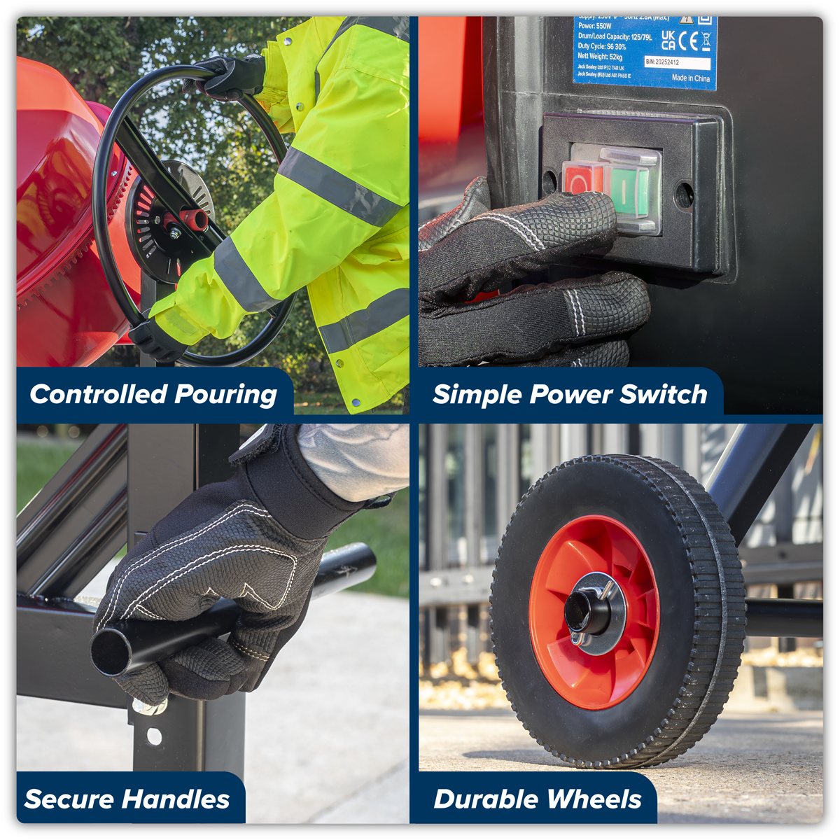 257.35 2026-01-09Powerful 550W insulated motor. 125L Drum with 79L mixing capacity. Easily attach or remove legs for storage or transportation. Large Ø200mm wheels for easy portability. Features folding legs for ease of transportation and storage.