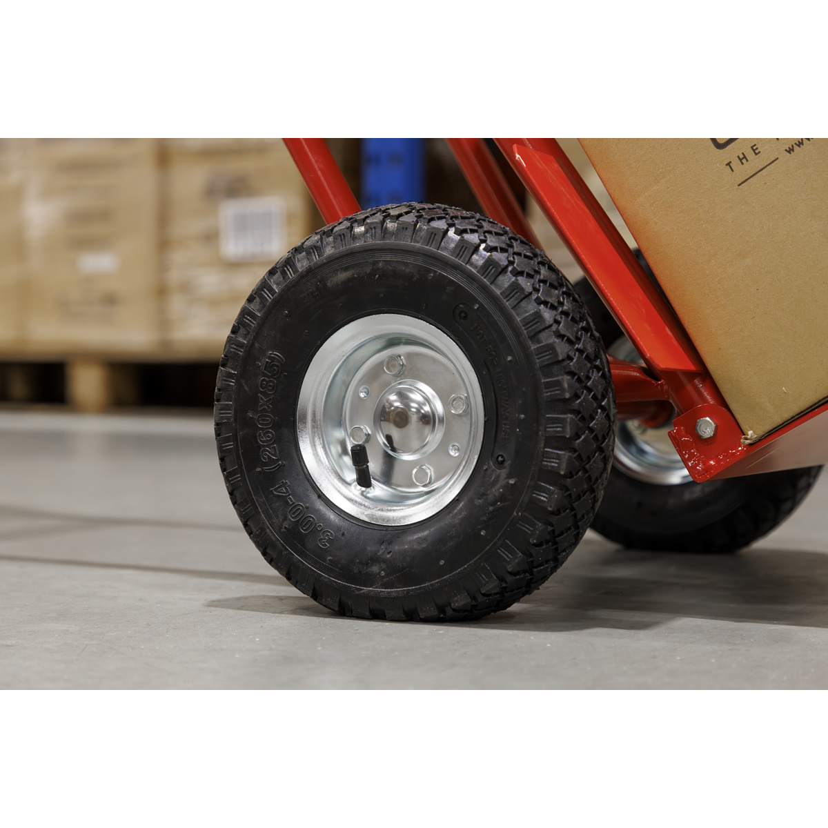 91.39 2025-12-22Extra-strong tubular steel framework with heavy-duty pneumatic tyres allow transport of load over rough terrain. Features foldaway toe plate and height-adjustable handles. Fitted with composite grip handles for added comfort and stability.