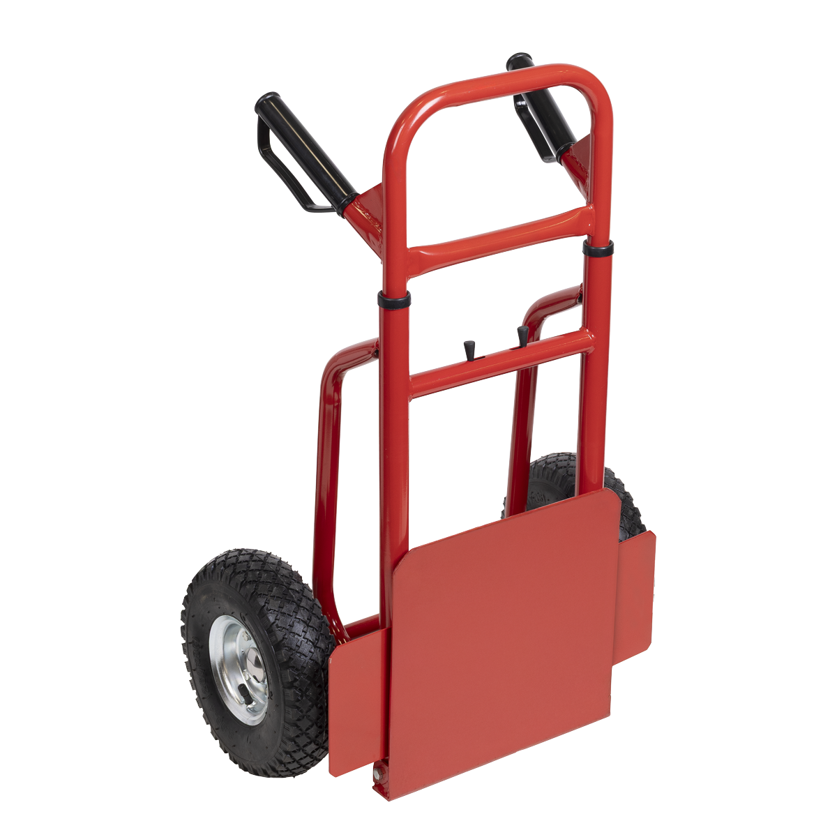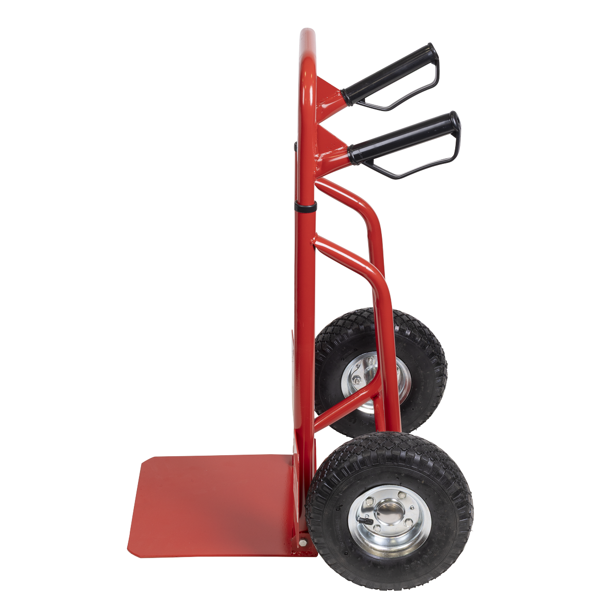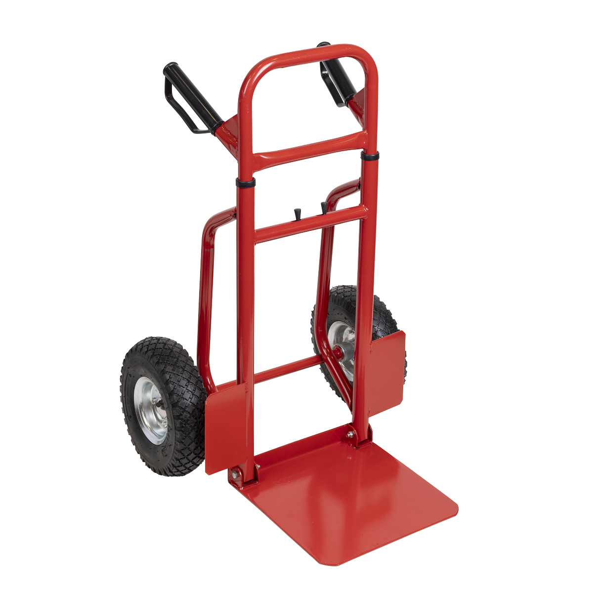 91.39 2026-01-11Extra-strong tubular steel framework with heavy-duty pneumatic tyres allow transport of load over rough terrain. Features foldaway toe plate and height-adjustable handles. Fitted with composite grip handles for added comfort and stability.