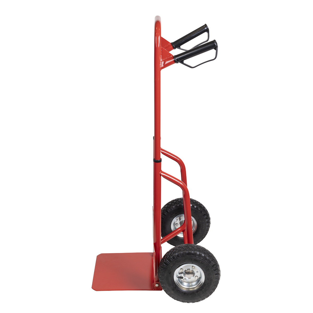 95.96 2026-02-22Extra-strong tubular steel framework with heavy-duty pneumatic tyres allow transport of load over rough terrain. Features foldaway toe plate and height-adjustable handles. Fitted with composite grip handles for added comfort and stability.