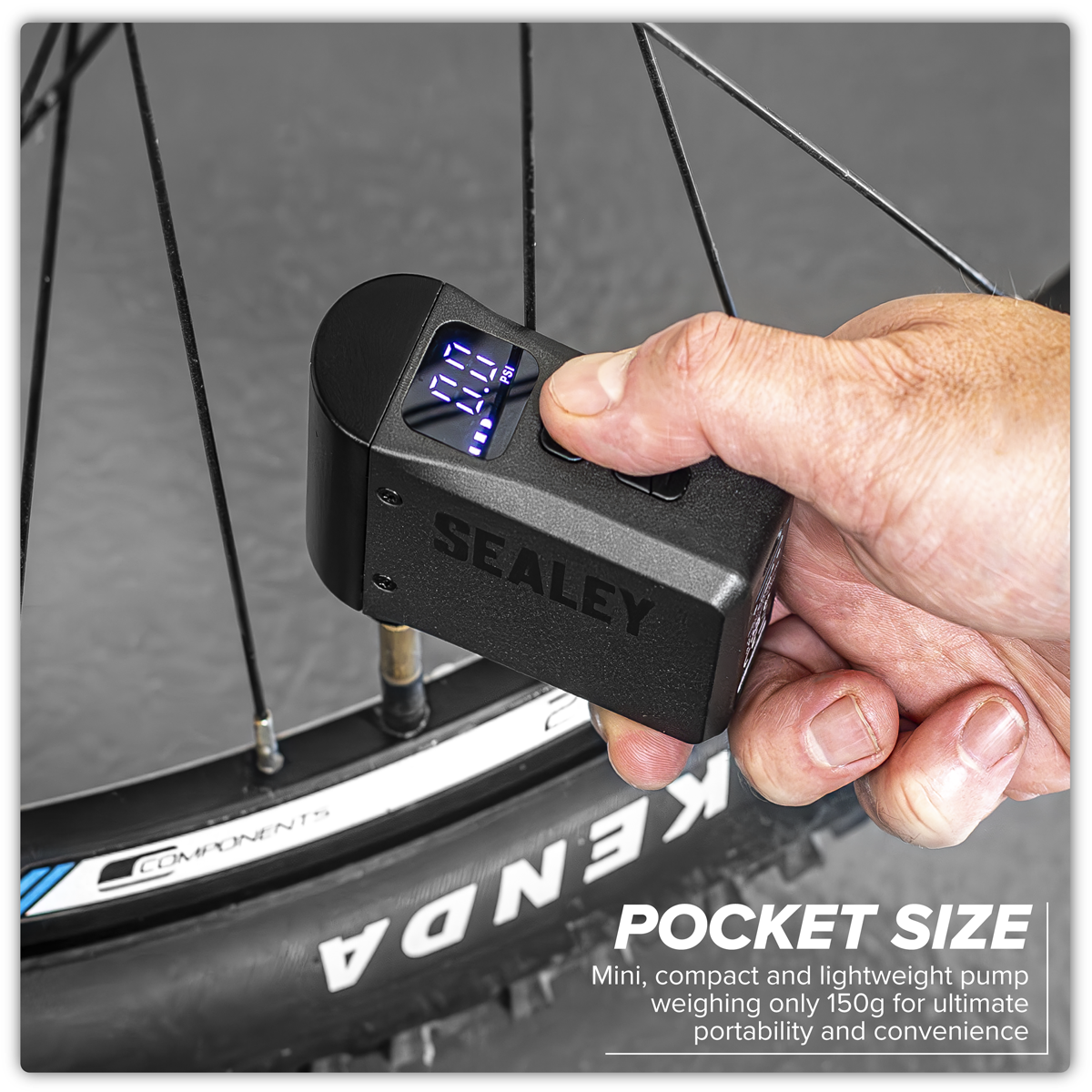 50.95 2025-11-29Compact, pocket-size pump for ultimate portability. Digital gauge with LCD screen for clear and accurate readings. Fast inflation reaches 0-30psi in 151 seconds. Pressure Range: 0-120psi(0-8bar). Can inflate two tyres on a single charge. 15L/Min airflow rate. Reads in bar and psi, with preset pressure settings with auto-cut-off for quick and easy inflation. Compatible for both Presta and Schrader valves. Rechargeable unit reaching full charge in 30mins (supplied with USB Type-C charging cable). Supplied with storage bag, ball spike and inflatables adaptor.