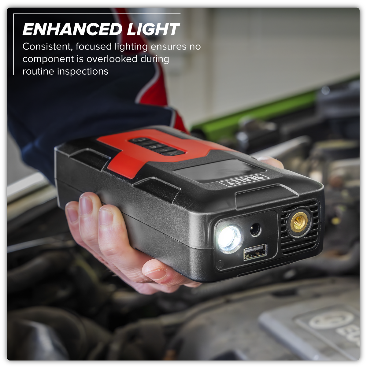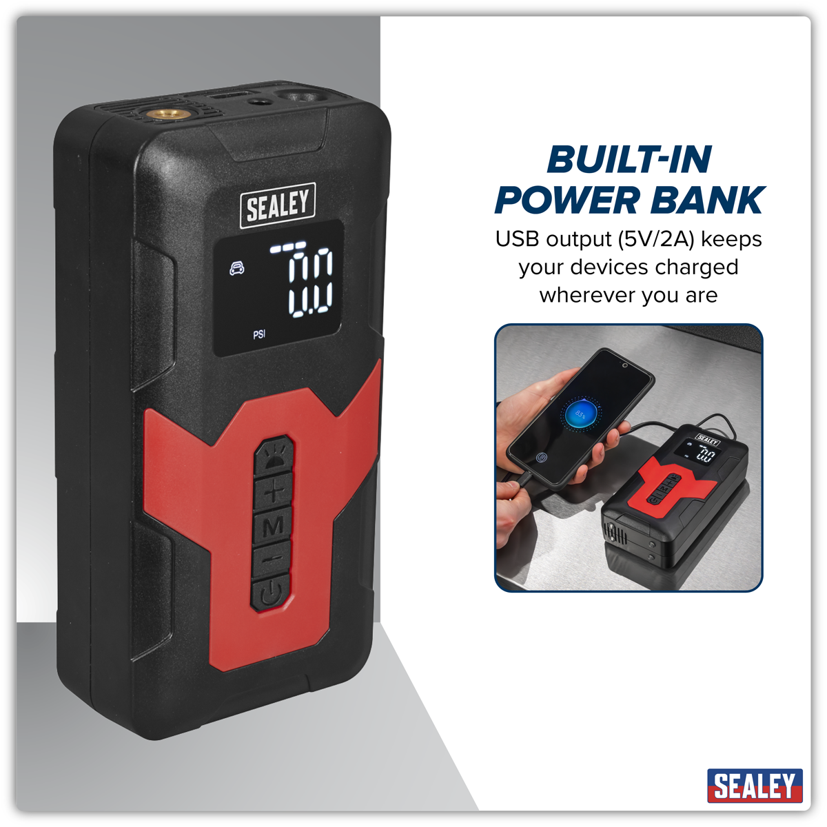 Suitable for inflating tyres on cars, vans, 4x4s, motorcycles and bicycles. Supplied with 12V plug for alternative power option when battery has run flat. Power bank with USB output (5V/2A). Maximum pressure 120psi, units in psi, kPa, kg/cm² and bar. Auto-stop feature. Airflow 0.68cfm 19L/min with an inflation time 0-30psi in 261sec (175/70/R13). Backlit LED digital display. 1W SMD LED Worklight with strobe and SOS light. Accessory kit includes 170mm extension tube with Schrader connection, Presta type adaptor, ball spike, inflatable adaptor, USB charging cable and storage bag.