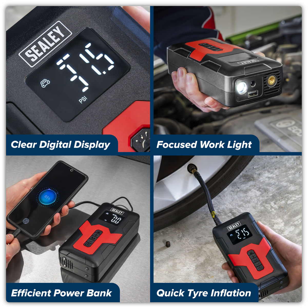 Instructions for the Sealey CTI140 Rechargeable Tyre Inflator & Power Bank with Worklight 12V