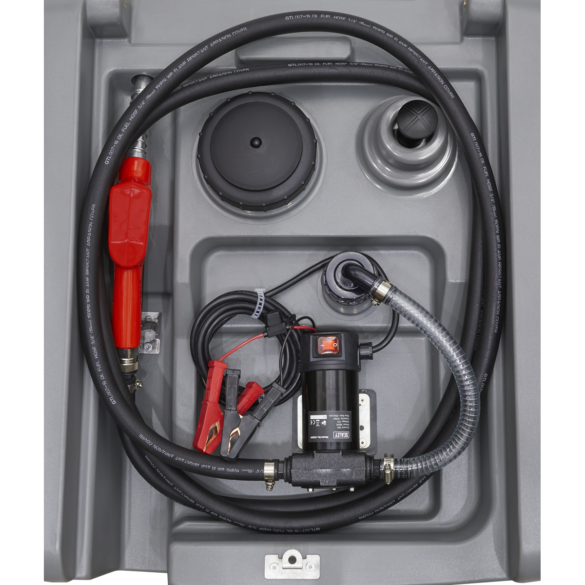 821.95 2026-02-13Manufactured from HDPE for the safe transportation and dispensing of diesel fuel when refilling on site equipment. Complies to ADR 1.1.3.1.C for exemption from requirements of ADR regulations. Supplied with a 12V electric pump, 4m electric cable and clamps, and a 4m delivery hose with automatic fuel nozzle. Can be safely secured and transported on a pick-up truck or van, using grooves for tie down straps and six handles for positioning. Supplied with lockable cover. Not suitable for petrol.
