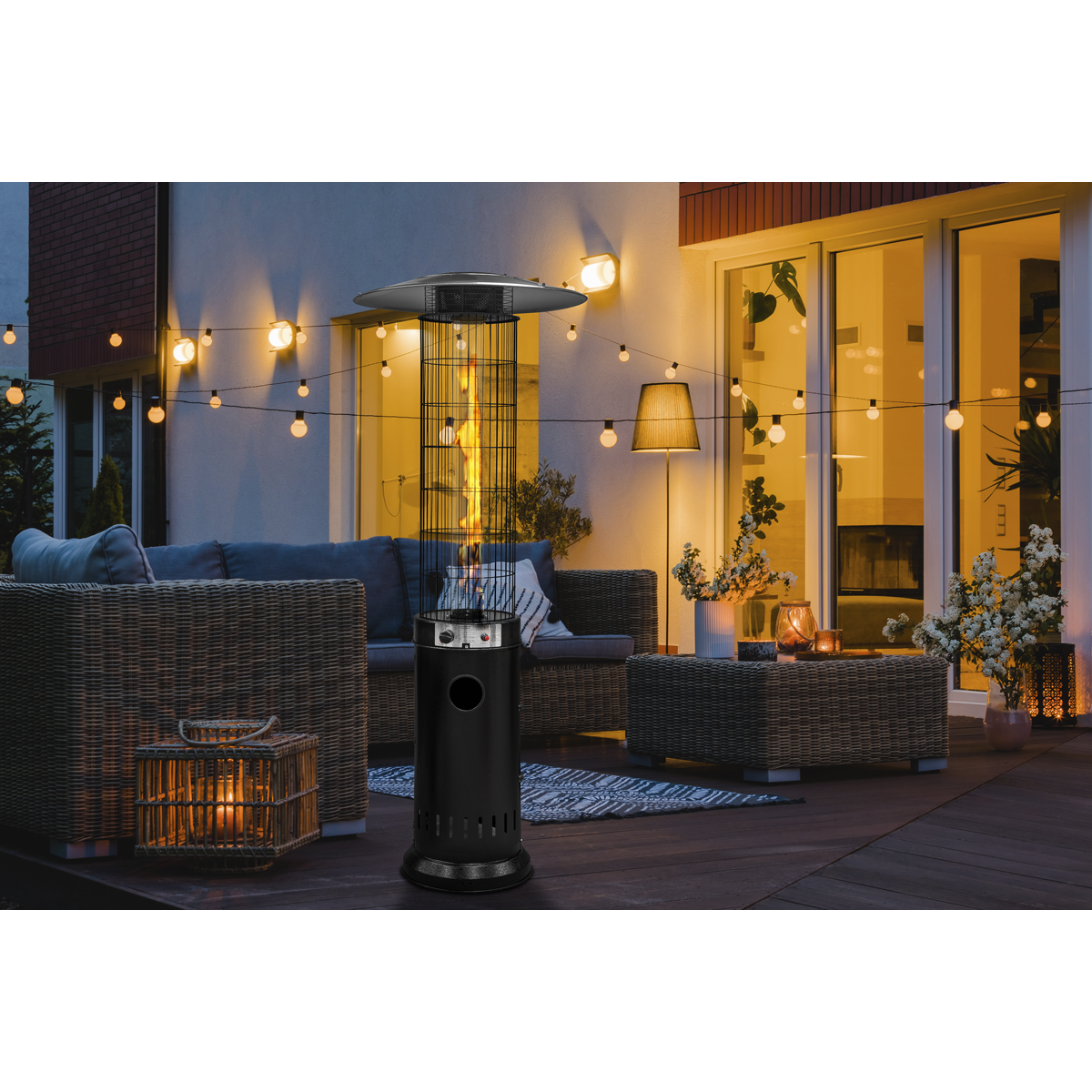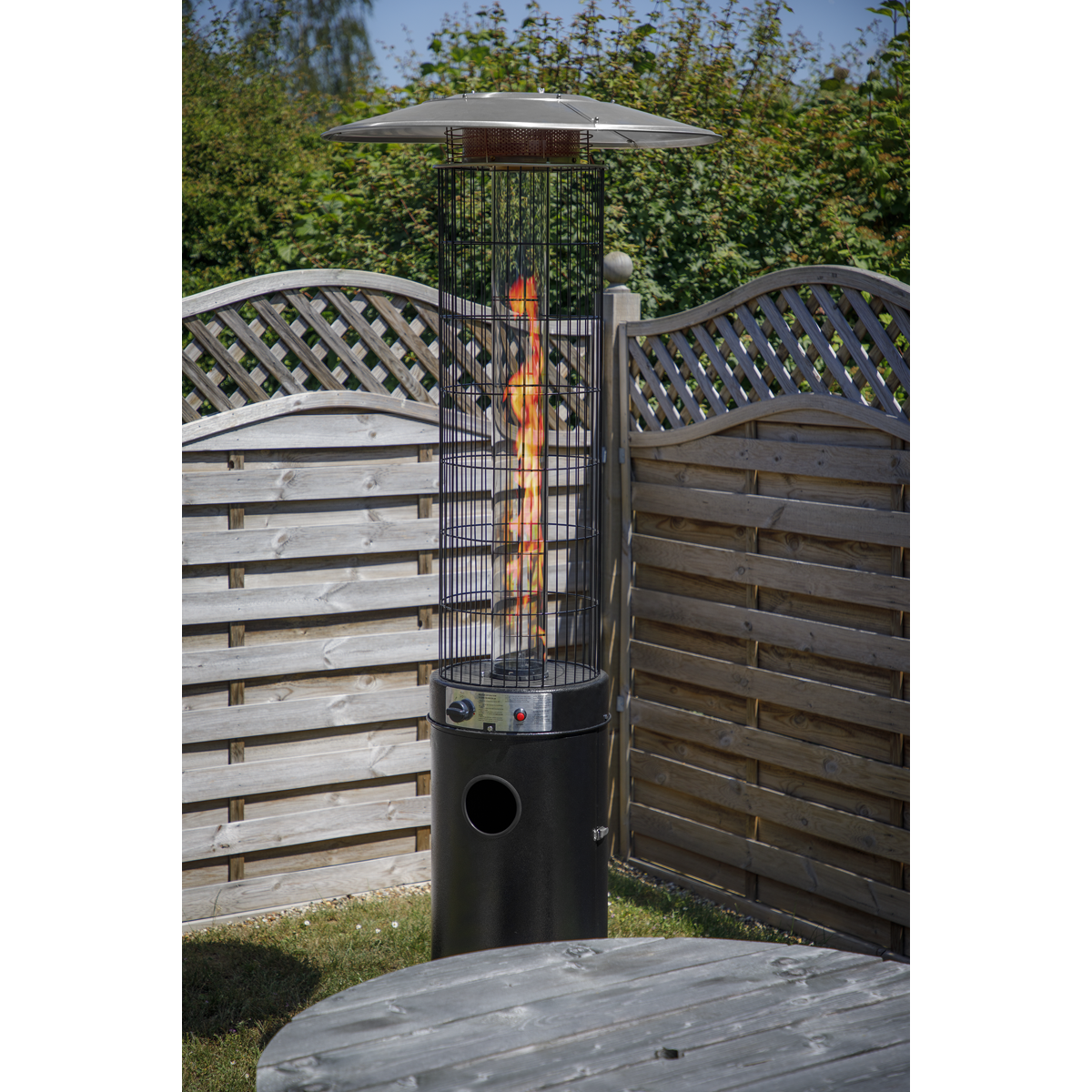 195.28 2025-11-02Innovative design of gas flame spiral style patio heater. Contemporary freestanding patio heater ideal for both commercial and domestic settings including restaurant and pub gardens, open workshops, boat yards, patios, forecourts and terraces. Standing at 2.1m tall, when lit the heater produces a real flame encompassed by a glass tube which heats the surrounding area. Metal reflector makes sure heat is directed downwards and outwards. Variable heat output controls make it fully adjustable. Features a fully enclosed gas cylinder chamber and safety tip-over switch. Supplied with regulator and hose assembly for use with propane patio gas bottles. Some assembly is required. For outdoor use only.