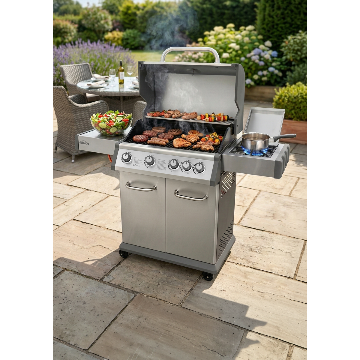 353.98 2026-05-06Gas BBQ with four stainless steel burners. Built-in thermometer enables you to easily keep track of your cooking temperature. Piezo ignition ensures a safe and easy start-up every time. High quality cast iron cooking grates with a matt enamel coating. Features side burner, perfect for cooking and preparing sides/sauces. Features side shelf giving extra room for preparation. Warming rack frees up space on the grill whilst keeping your food warm after cooking. Supplied with regulator and hose assembly for use with propane patio gas bottles. Features four universal castor wheels for easy manoeuvrability. Some simple assembly is required. Dellonda BBQ Cover Model No. DG25 (supplied separately) is a perfect fit for this BBQ.
