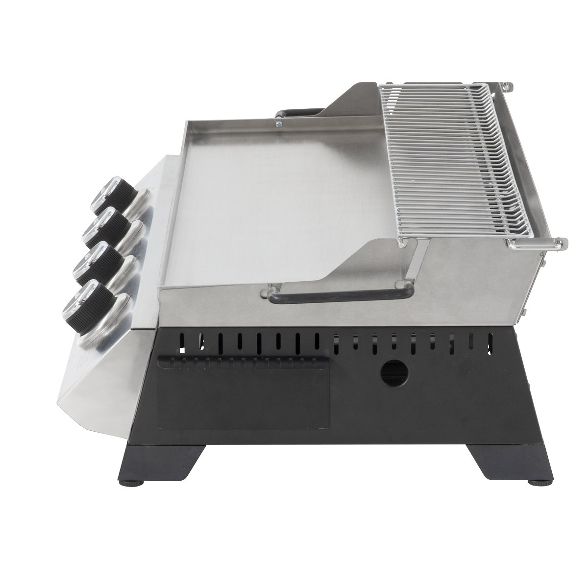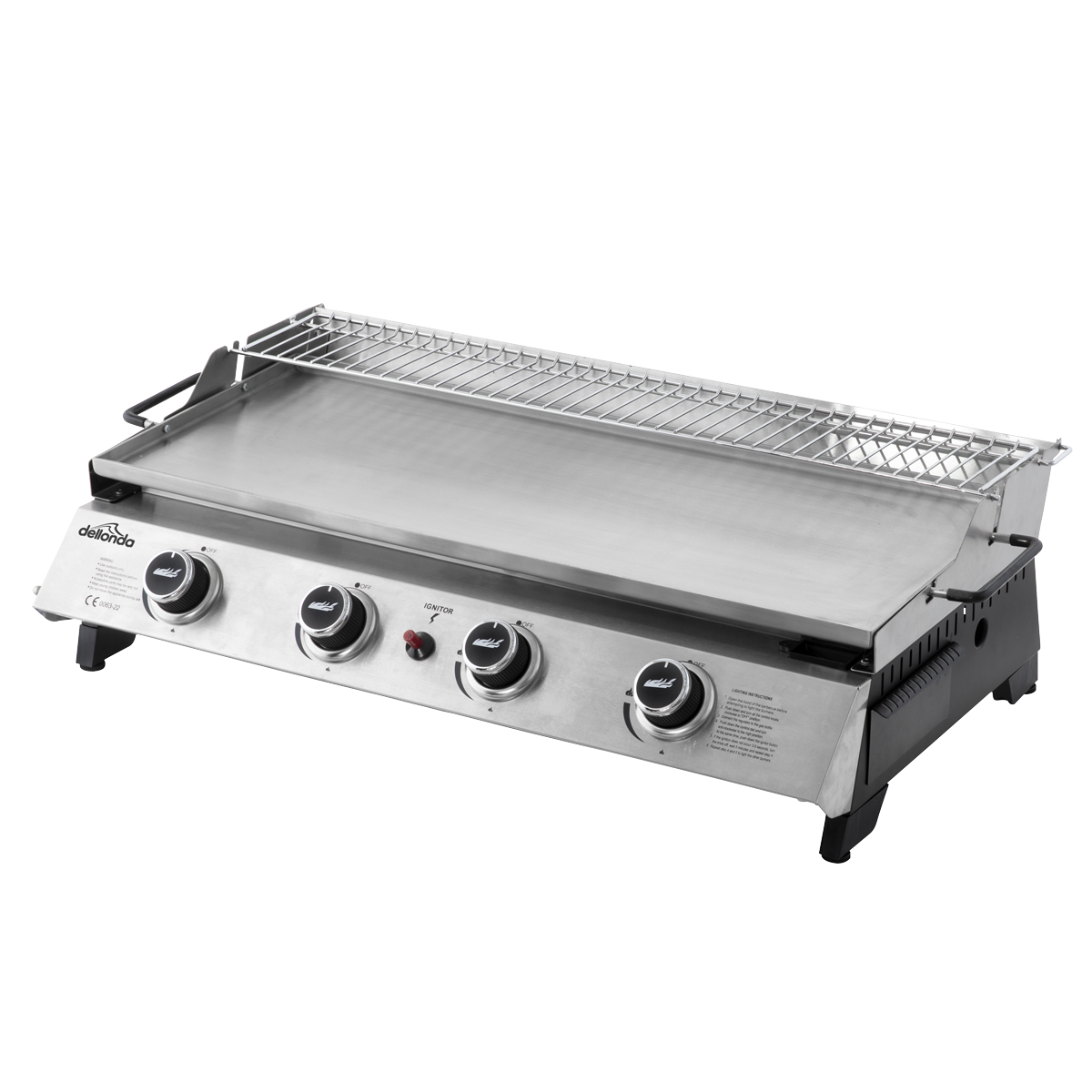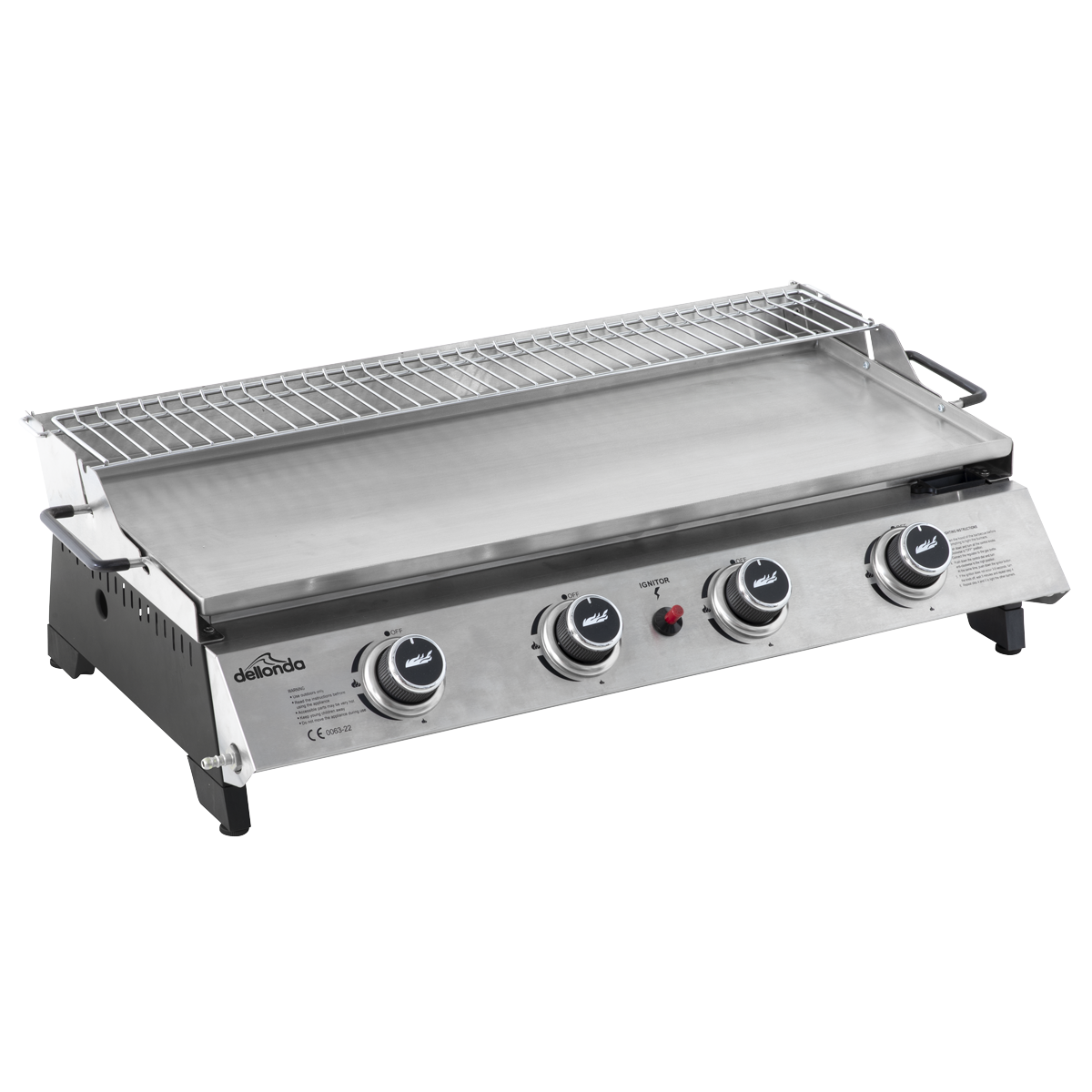 290.98 2026-03-26Plancha bbq grill with four stainless steel burners gives even heat distribution. Also features stainless steel warming rack meaning you can keep your cooked food warm while still grilling. Plancha cooking uses low-fat, high-heating cooking with no flare-ups. Ideal for all kinds of food such as eggs, pancakes, sausages, salmon, steak, vegetables and so much more. Piezo ignition ensures a safe and easy start-up every time, just press the button, no matches needed. Just wipe down the large stainless steel, non stick surface after use and the drip tray removes any excess liquids. Supplied with regulator and hose assembly for use with propane patio gas bottles.