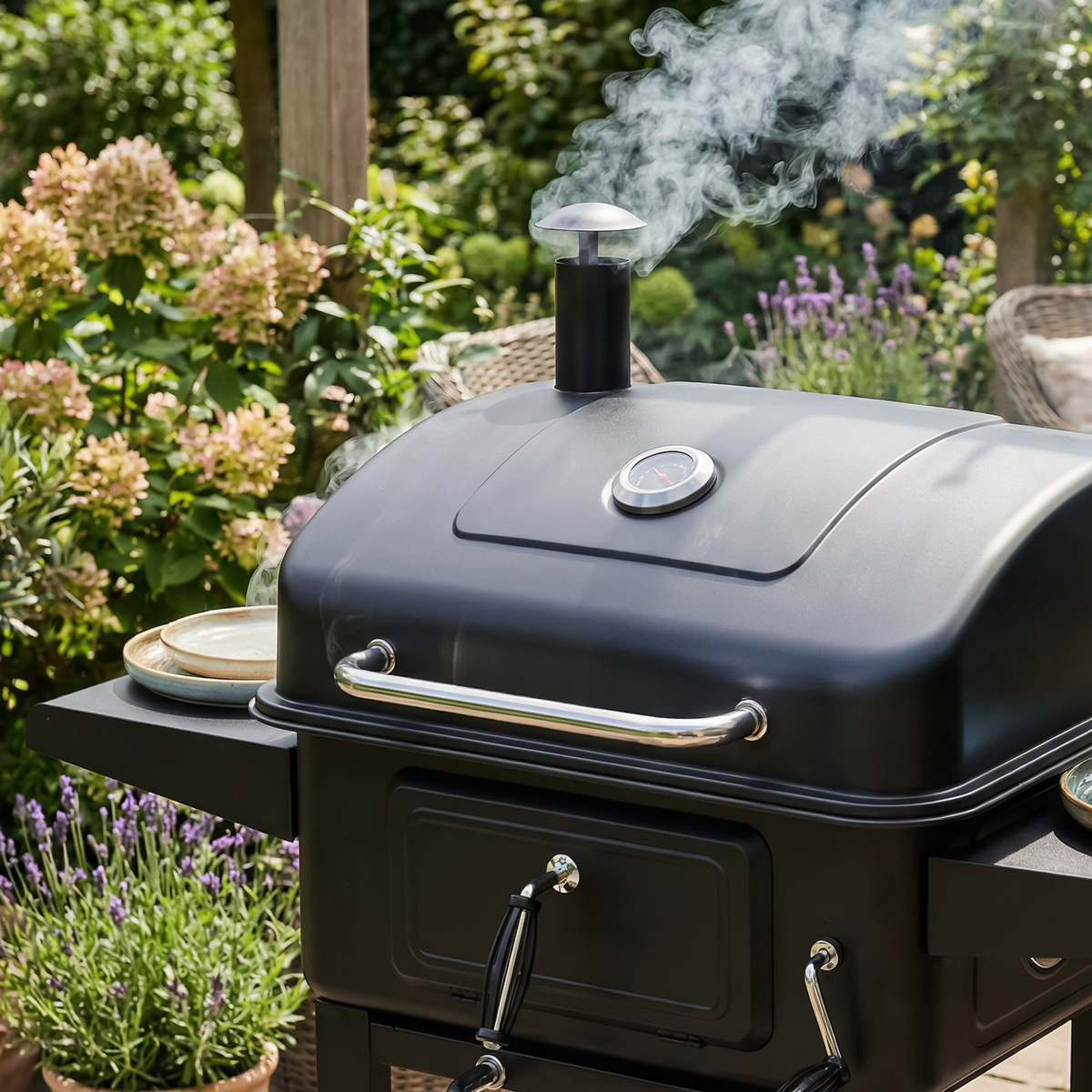 149.38 2026-03-26A spacious cooking grid provides ample space to grill, smoke, or BBQ multiple items at once. Built-in thermometer, adjustable charcoal pan, and 2 air vents with a chimney ensure precision heat and smoke regulation. Front hatch allows for quick and easy addition of charcoal without disrupting your cooking. Features 2 wheels for easy transportation, 2 side tables for prep, and 4 utensil hooks for tools. Chrome-plated warming rack keeps dishes at serving temperature while you focus on grilling.