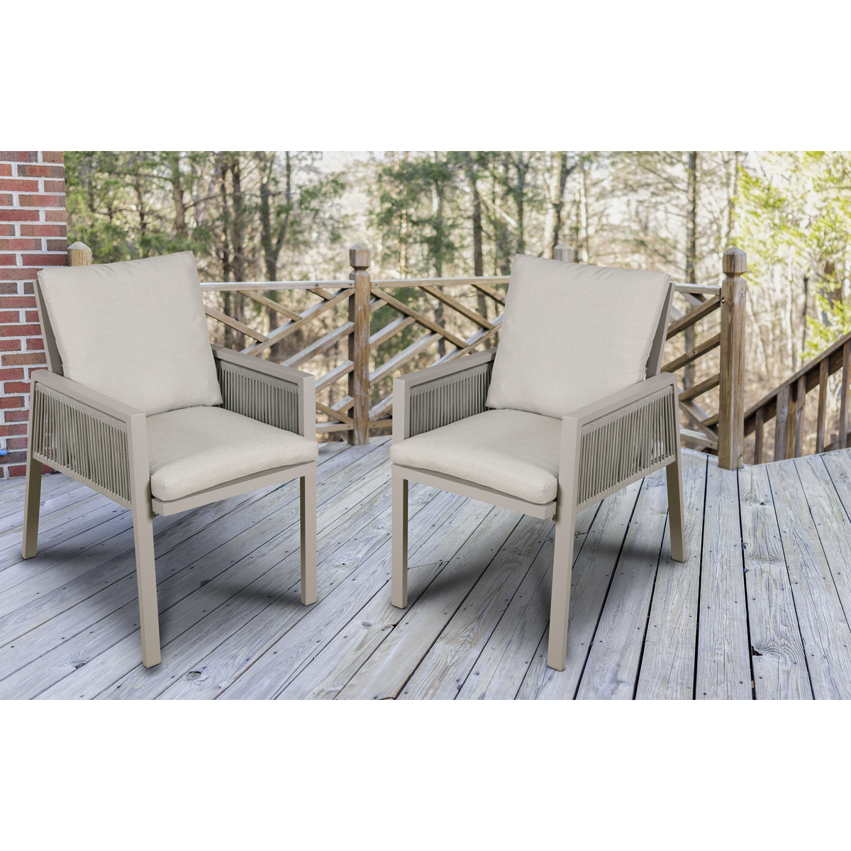 379.48 2026-05-26The perfect choice for your outdoor seating space. These comfortable chairs are ideal for having dinner, reading and relaxing with your family and friends. Manufactured from rust free aluminium, supplied with a padded cushion back and feature comfortable armrests. 8mm Textilene rope side, which is breathable, UV treated, fade resistant and durable enough to withstand rain and wind for long time use. When dirty, just wipe with a damp or dry cloth. The comfortable 5cm polyester seat cushions and back cushions allow for relaxing whilst enjoying your garden. Designed with your comfort in mind yet are easy to clean as the covers can be removed and hand washed for easy maintenance.