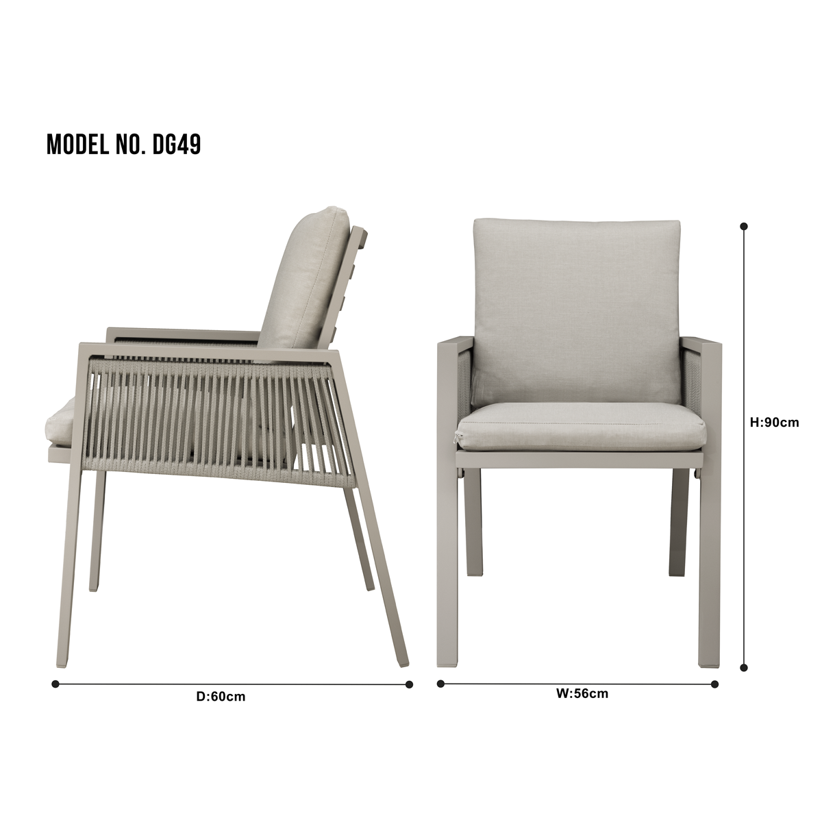 379.48 2026-05-04The perfect choice for your outdoor seating space. These comfortable chairs are ideal for having dinner, reading and relaxing with your family and friends. Manufactured from rust free aluminium, supplied with a padded cushion back and feature comfortable armrests. 8mm Textilene rope side, which is breathable, UV treated, fade resistant and durable enough to withstand rain and wind for long time use. When dirty, just wipe with a damp or dry cloth. The comfortable 5cm polyester seat cushions and back cushions allow for relaxing whilst enjoying your garden. Designed with your comfort in mind yet are easy to clean as the covers can be removed and hand washed for easy maintenance.