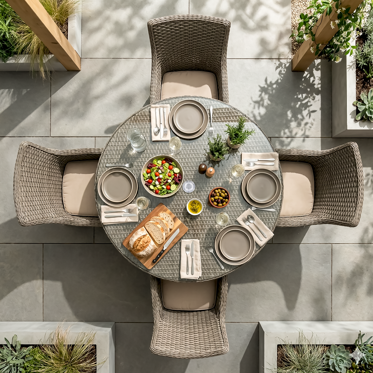 1203.73 2026-05-067-Piece outdoor rattan dining set is perfect for socialising with family and friends. Set includes six dining chairs with armrests and one dining table with glass tabletop and parasol hole. Dining table and chairs are manufactured using premium quality PE weave rattan material. UV Treated, fade resistant and weatherproof design means this set can be used outside all year round. Chairs are supplied with polyester covered cushions. Cushion covers can be removed and hand washed for easy maintenance. *Disclaimer: Colours may slightly vary due to lighting conditions.