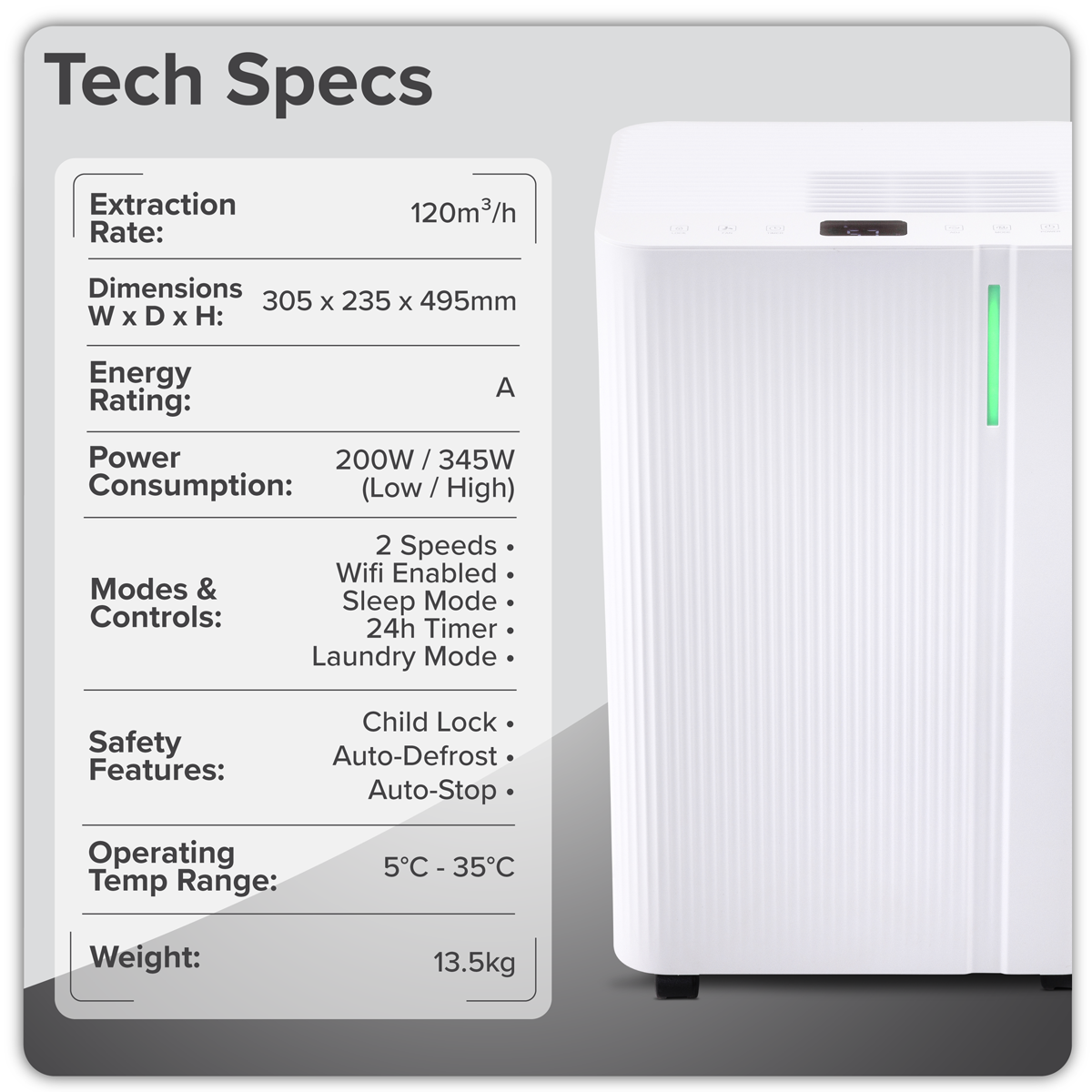 178.18 2026-05-26Can circulate and dehumidify 120m³/h this is enough to clear multiple rooms with one single unit. Low running cost as this product is rated as A-class efficiency. Reciprocating compressor ensures no distracting noise while in use working at a whisper quiet 43dB. Compact design with four swivel castors and side handle makes moving the unit between rooms effortless. Digital colour display and multiple modes including auto mode, laundry mode and sleep mode. Laundry mode aids in the fast and effective drying of clothes inside. Can operate at temperatures as low as 5°C and as high as 35°C meaning this unit works perfectly at any time of the year. Unit can be used in continuous drainage mode and safety features include automatic stop when 4.5L tank is full, 24-hour timer, child lock and auto defrost. Suitable for rooms 20-30㎡ in size. WIFI enabled using either Tuya or Smartlife app.