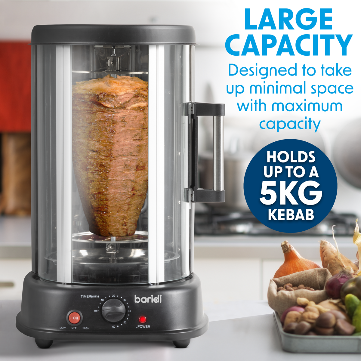 88.18 2025-11-0121L rotating vertical grill, capable of cooking Doner Kebabs/Gyros/Shawarmas, independent skewers, whole chickens or joints of meat, fish and vegetables. Spit set also includes seven skewers for vegetable or Shish kebabs, food baskets and two baking trays. Fitted with a sliding glass door and 60 minute timer with auto shut-off, half or full power settings and drip tray to catch any juices. Power: 1500W.
