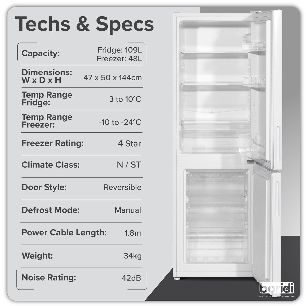 227.38 2026-01-03157L Capacity offers ample storage space for food and other frozen goods, suitable for small to medium-sized households. Features 109L refrigeration compartment for fresh food storage and 48L freezer compartment for frozen goods. Reversible door allows you to open from either the left or the right side based on your kitchen layout or preference. Reduces the buildup of frost inside the freezer, minimizing the need for manual defrosting and ensuring efficient performance over time. A mechanical thermostat easily allows you to adjust the temperature of your fresh and frozen goods. Comes with a 4-Star Freezer rating for its ability to maintain a temperature of -18℃, making it safer for long term storage of frozen goods.