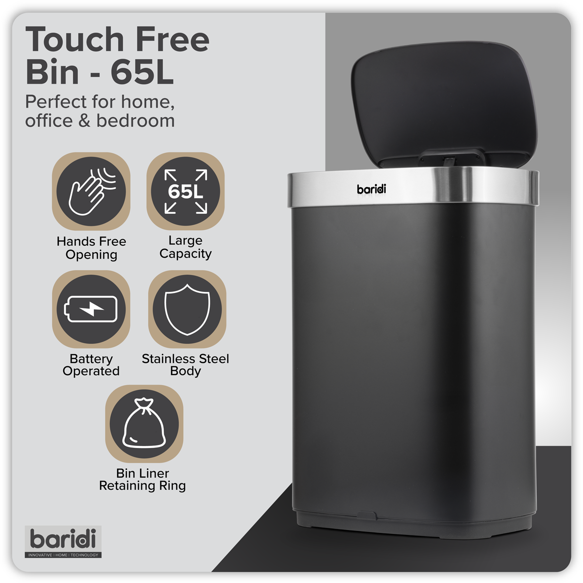 98.98 2026-01-29Spacious 65L capacity is ideal for home and office use. Motion sensor opens the bin automatically for hygienic, touch free waste disposal. Powered by 6 x AA batteries (not included), keeping your floorspace clean. Ring retainer keeps bin liners securely in place for a neat and tidy look.