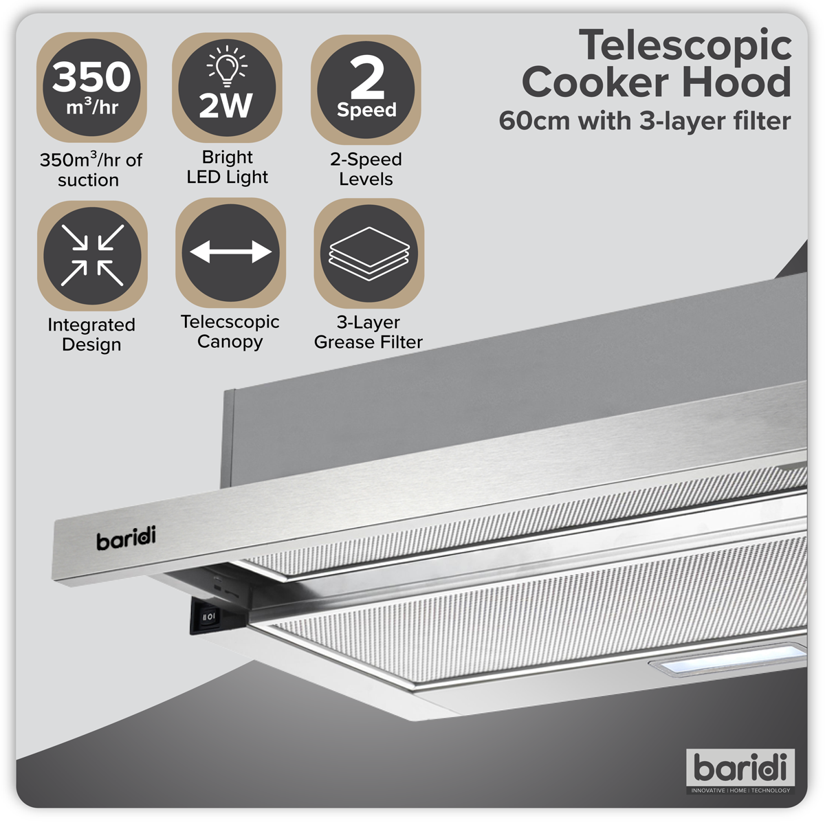 98.98 2026-01-23Save money with an A+ extractor hood compared to the B and C hoods. Higher efficiency means less noise and a more powerful fan without the need for higher electricity bills. 33 Watts of power with 350m³/h of suction is more than enough to freshen your kitchen and keep cooking fumes out of the rest of your house. Rocker switch gives you the power to choose between two fan speeds to match your kitchens needs. Beautiful look, this elegant yet modern wall hood delights, effortlessly bringing style to any kitchen type. Supplied with 2, 3-layer aluminium filters to keep your air fresh.