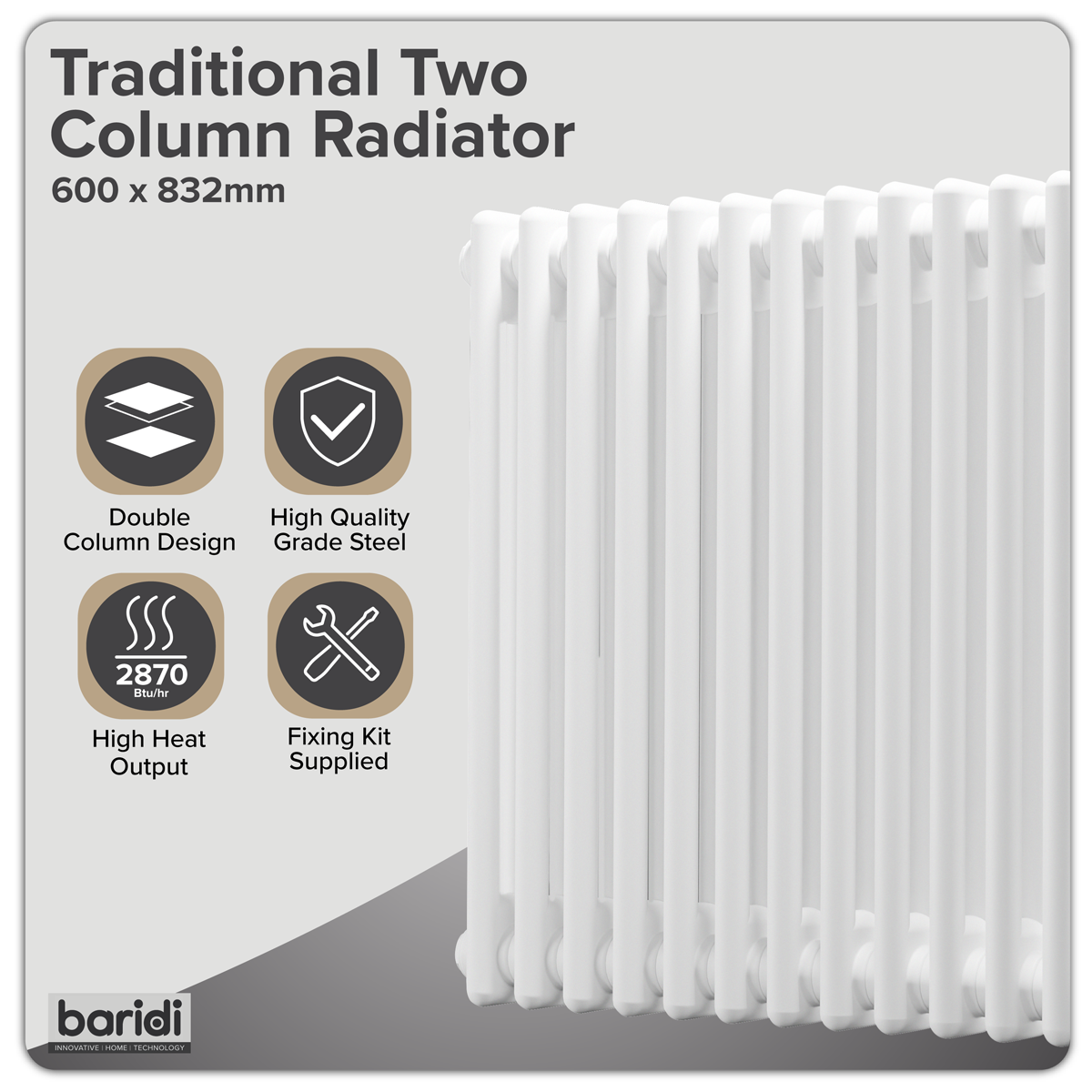 151.18 2026-05-12Horizontal traditional two column radiator delivers a BTU output of 2870BTU/hr. With two column configuration for increased output delivering consistent warmth across compact spaces. In a traditional styling that suits all environments. Supplied with wall brackets and fixings for straightforward fitting. Fully compatible with all UK central heating setups for seamless integration. Constructed from high-grade steel for long-term reliability. Available in multiple sizes and colours to suit different room sizes and layouts. *Please note: Radiator valves are not included.