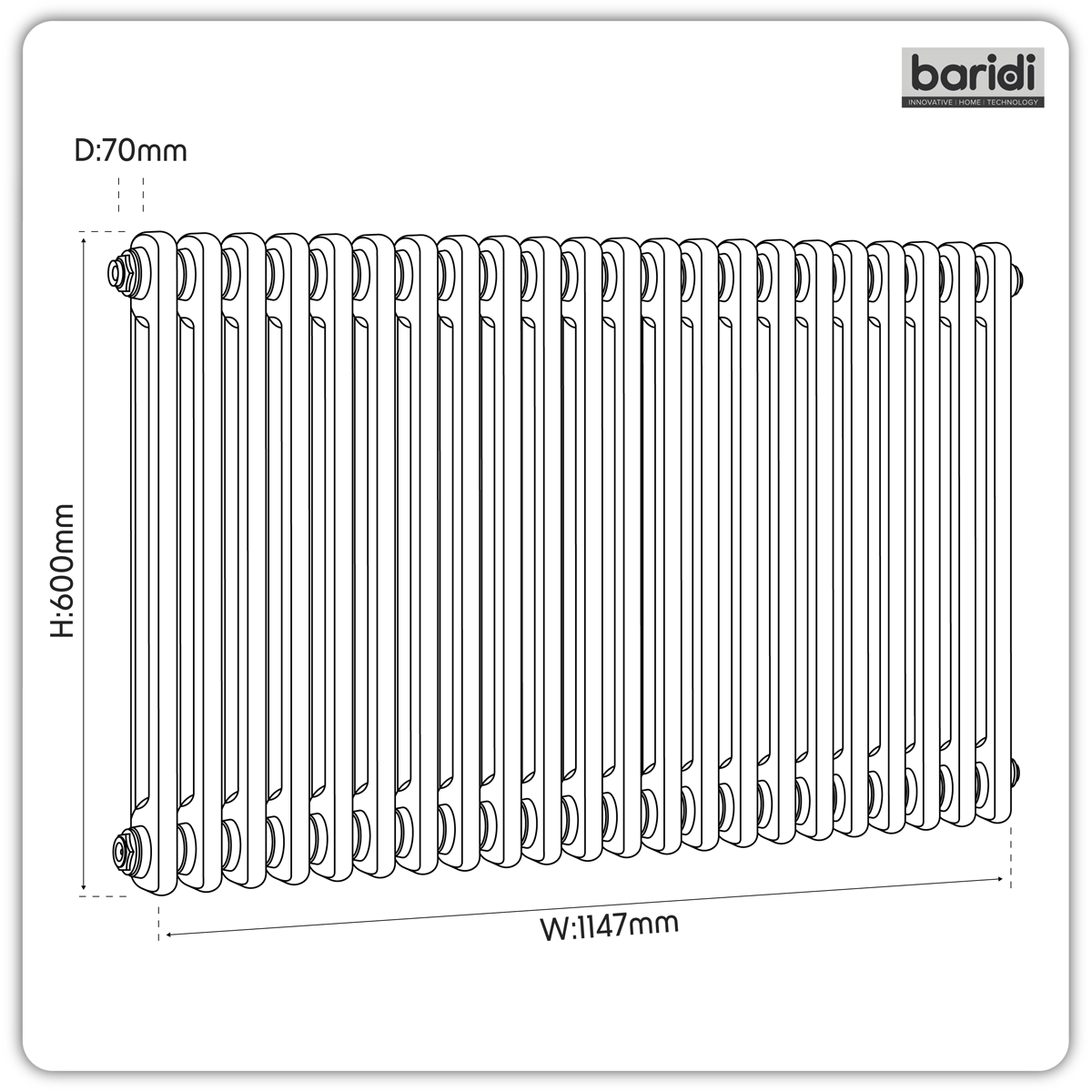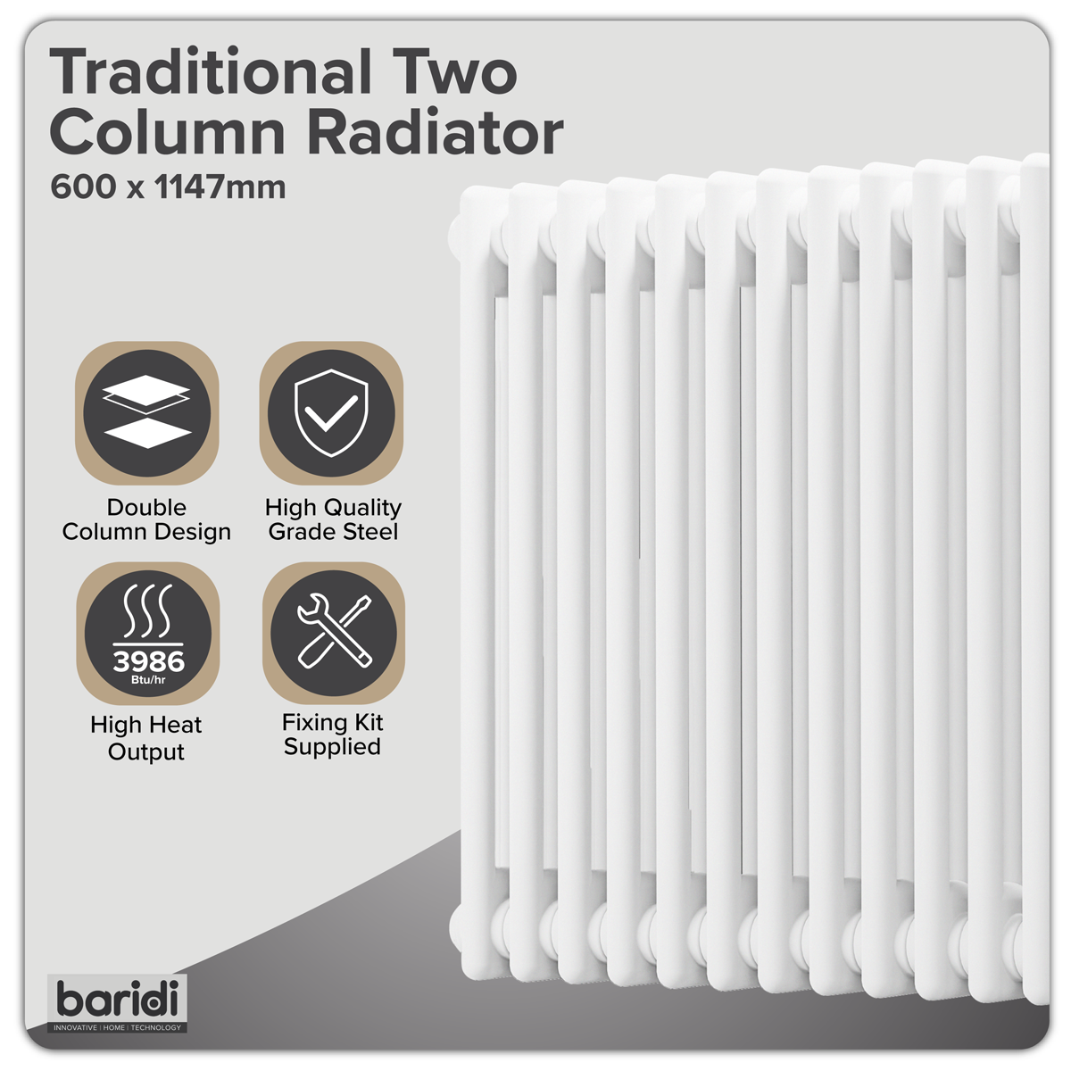 197.08 2026-05-12Horizontal traditional two column radiator delivers a BTU output of 3986BTU/hr. With two column configuration for increased output delivering consistent warmth across compact spaces. In a traditional styling that suits all environments. Supplied with wall brackets and fixings for straightforward fitting. Fully compatible with all UK central heating setups for seamless integration. Constructed from high-grade steel for long-term reliability. Available in multiple sizes and colours to suit different room sizes and layouts. *Please note: Radiator valves are not included.