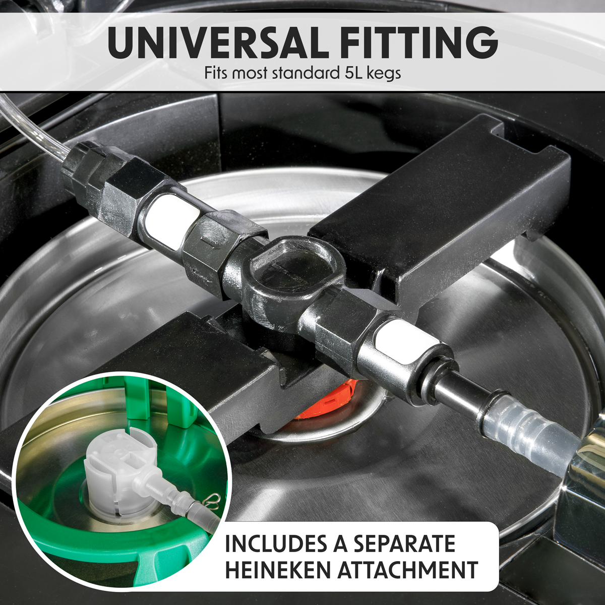 161.98 2026-04-16Universal fitting for all 5L beer kegs. Thermoelectric cooling technology chills beer to as low as 4°C. Keeps beer fresh for up to 30 days. Removable drip tray with raised lip helps prevent spillage. LED temperature gauge. Operates using standard 16g CO2 canisters. Modern stainless steel and black design. Supplied with 3 x 16g CO2 canisters and universal attachment kit.