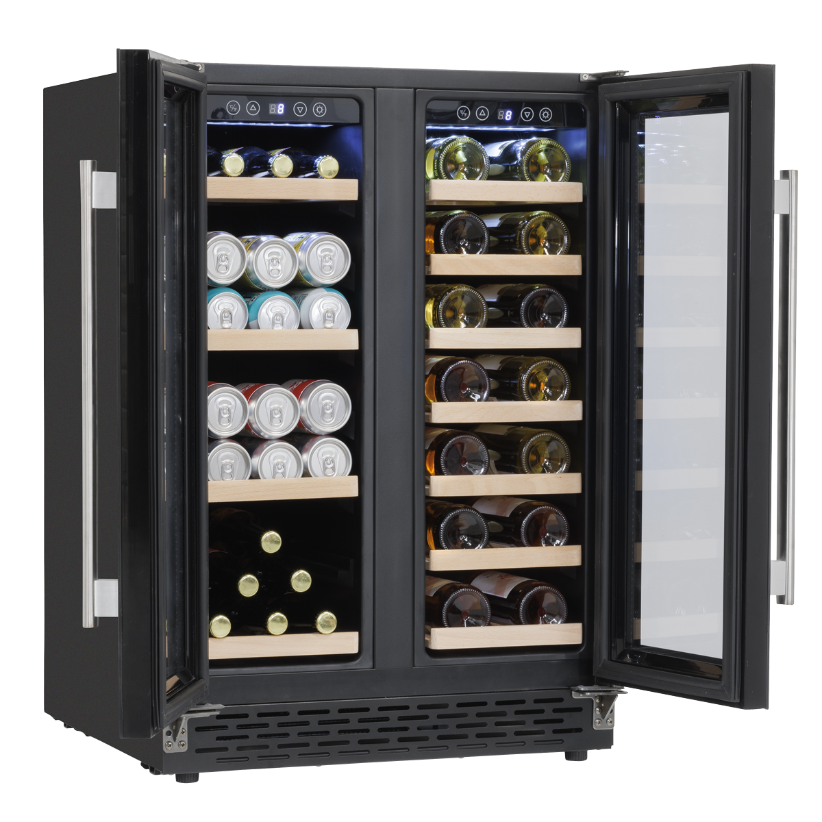 620.38 2026-03-27Add style to your kitchen with this 60cm, dual zone wine cooler. The two-door design and 40 bottle capacity make a perfect addition to any kitchen. Fits under standard height worktops, and in standard 60cm unit spaces. The bottom of the doors align with the bottom of cabinets for an integrated appearance. Dual cooling zones with digital temperature control between 5-20°C allowing you to chill up to 40 bottles of wine to the perfect temperature. Stylish stainless steel door handle, wooden shelves and internal LED light keeps this modern unit looking fresh. Super quiet compressor cooling with a noise level of just 41dB, combined with double glazed glass results in a whisper quiet wine cooler.