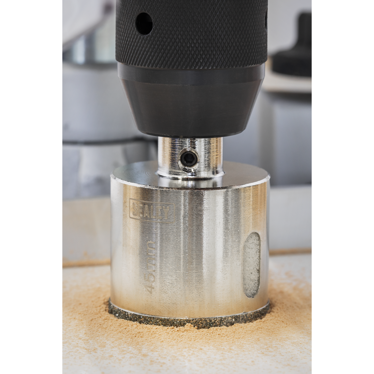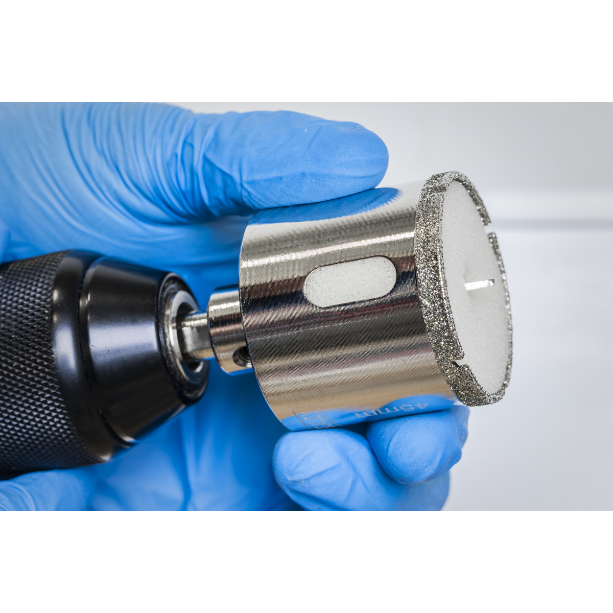 10.82 2026-01-03Electroplated diamond coated hole saw. The diamond coated cutting edge allows precise chip-free cutting of glass, granite, marble, porcelain and ceramics. With an integrated water-cooling sponge that prolongs the life of the cutting edge by reducing heat build-up. Sponge must be soaked in water before use. Ø45mm and 45mm cutting depth makes this range ideal for plumbing and electrical installations. Rounded 10mm hex shank means it will fit both handheld or pillar drill chucks.