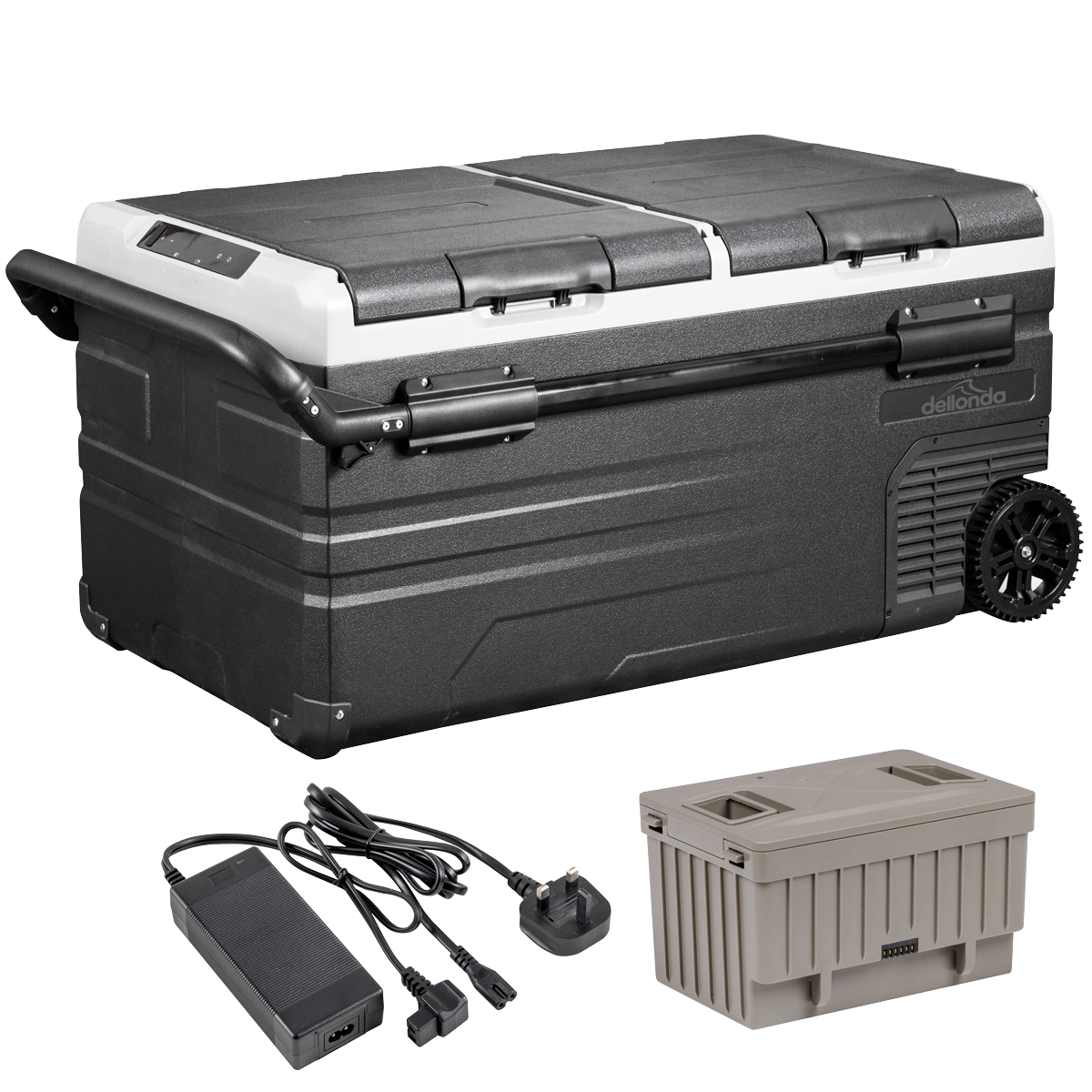 608.98 2026-05-0595L Portable compressor fridge freezer cool box. Lightweight and compact design with handles allowing you the flexibility to take with you anywhere you go. 173W and 15,600mAh capacity means that you can run your fridge while off grid, camping, at the beach or enjoying a picnic in the countryside. Adaptor allows you to use your car fridge in your home as well as in your car. Battery can recharge from mains, car charger or via solar panel (not included) when battery inserted into fridge.