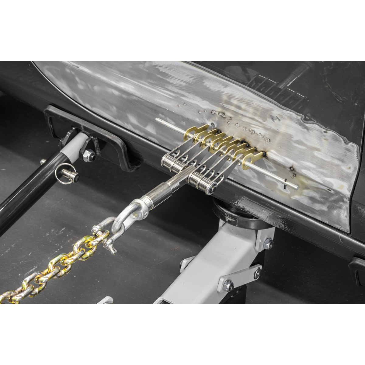 1139.95 2026-05-06Designed for controlled straightening of body panel damage. Adjustable vertical post provides eight indexed pulling angles plus a vertical pull position. Supplied with manual hydraulic pump and ram, pulling chain, six claw pulling hook, sill support arms and wheel base plate. Manual hydraulic pump delivers high pulling force with reduced operator effort. Wheel base plate provides secure anchoring and improved operational stability during pulling operations.
