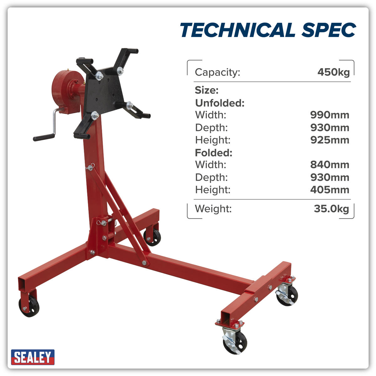 430.45 2025-12-02This engine stand accepts a wide variety of engines and transmissions. The Geared Handle Drive allows for easy and accurate 360º rotation in order to access all parts of the engine. Mounting head has four fully adjustable arms with bolt holes to accommodate various load sizes. Fitted with screw lock to ensure load is secured. Swivel castors provide excellent manoeuvrability. Assembled with clevis pins and clips so the stand can be folded for storage. Maximum Load Length: 700mm.
