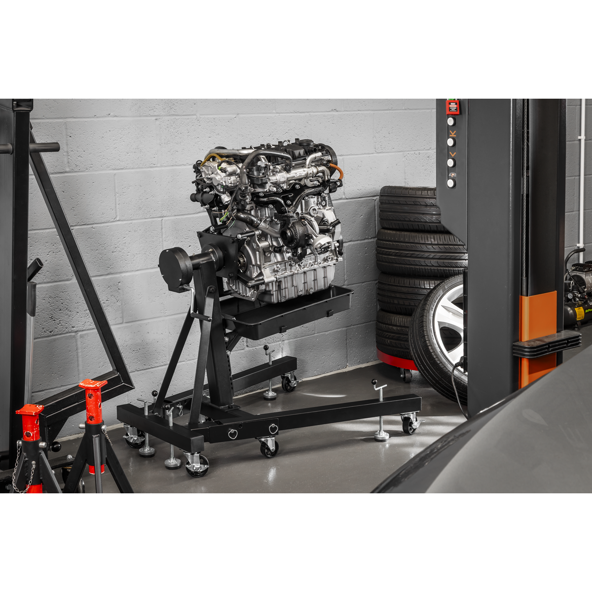 479.95 2026-05-26Gear-driven stand rotates engine blocks with ease and locks securely in place. V-frame design ensures solid support during use. All-steel construction supports up to 680kg. Faceplate with four adjustable arms suits various configurations. Six swivel castors, four with locks for safe positioning. Four stabilising feet provide extra security. Folding legs allow easy storage when not in use. Supplied with an integrated, height adjustable, oil drain pan.