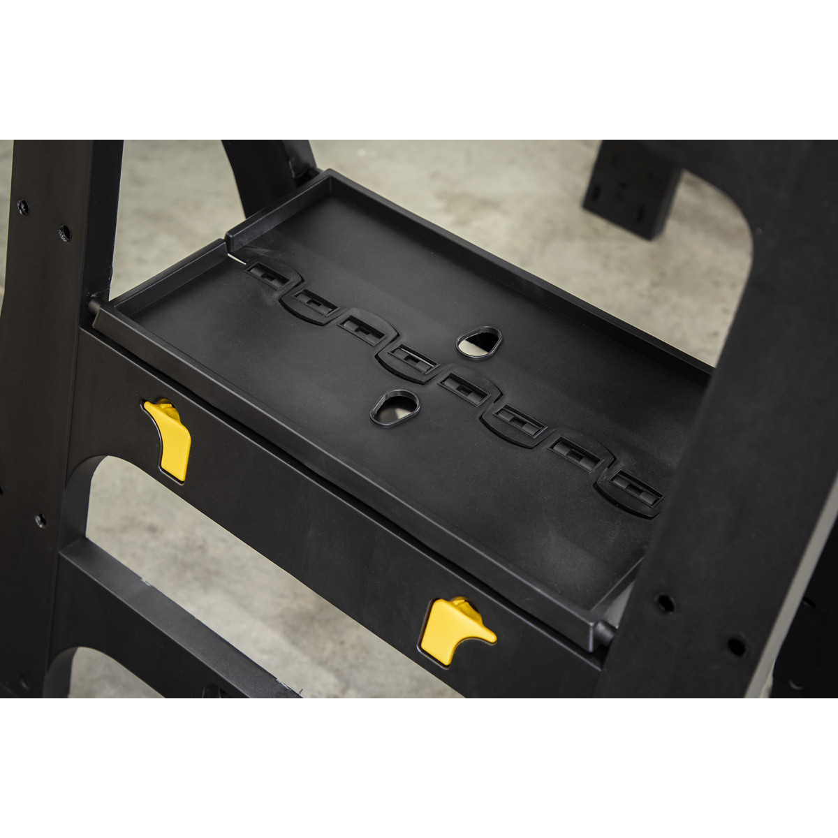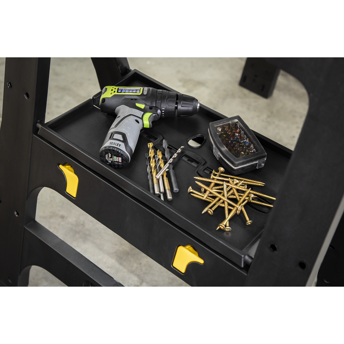 70.46 2026-01-11Manufactured from 30mm thick heavy-duty composite material, with ribbed rubber feet for added stability. Ideal for supporting large workpieces when cutting, drilling and sawing. Rubber ring anti-slip grips for added workpiece stability. Four composite hooks, two either side, allow for work material to be positioned to enable quick and easy-access. Fully collapsible for easy storage and transportation.