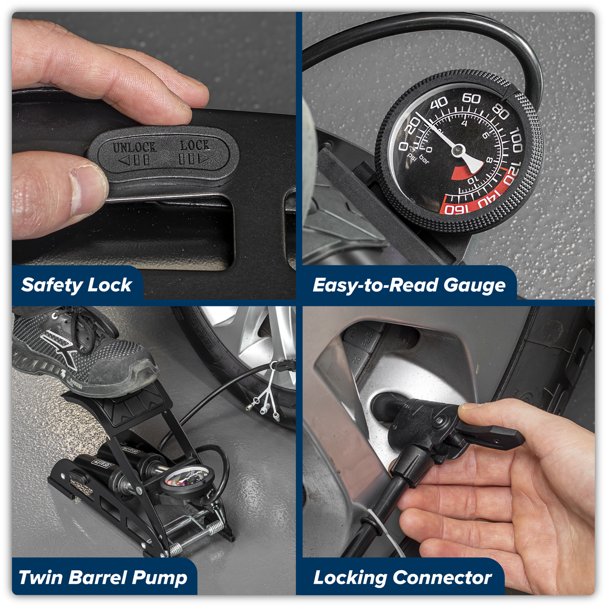 22.04 2026-04-28High power, steel framed foot pump with two Ø44 x 110mm aluminium barrels. Ø75mm dial type pressure gauge calibrated in psi and bar and ranges from 0-160psi and 0-10bar. Suitable for Presta and Schrader valve. Fitted with 650mm flexible pressure hose with locking connector. Fitted with safety locks for security.
