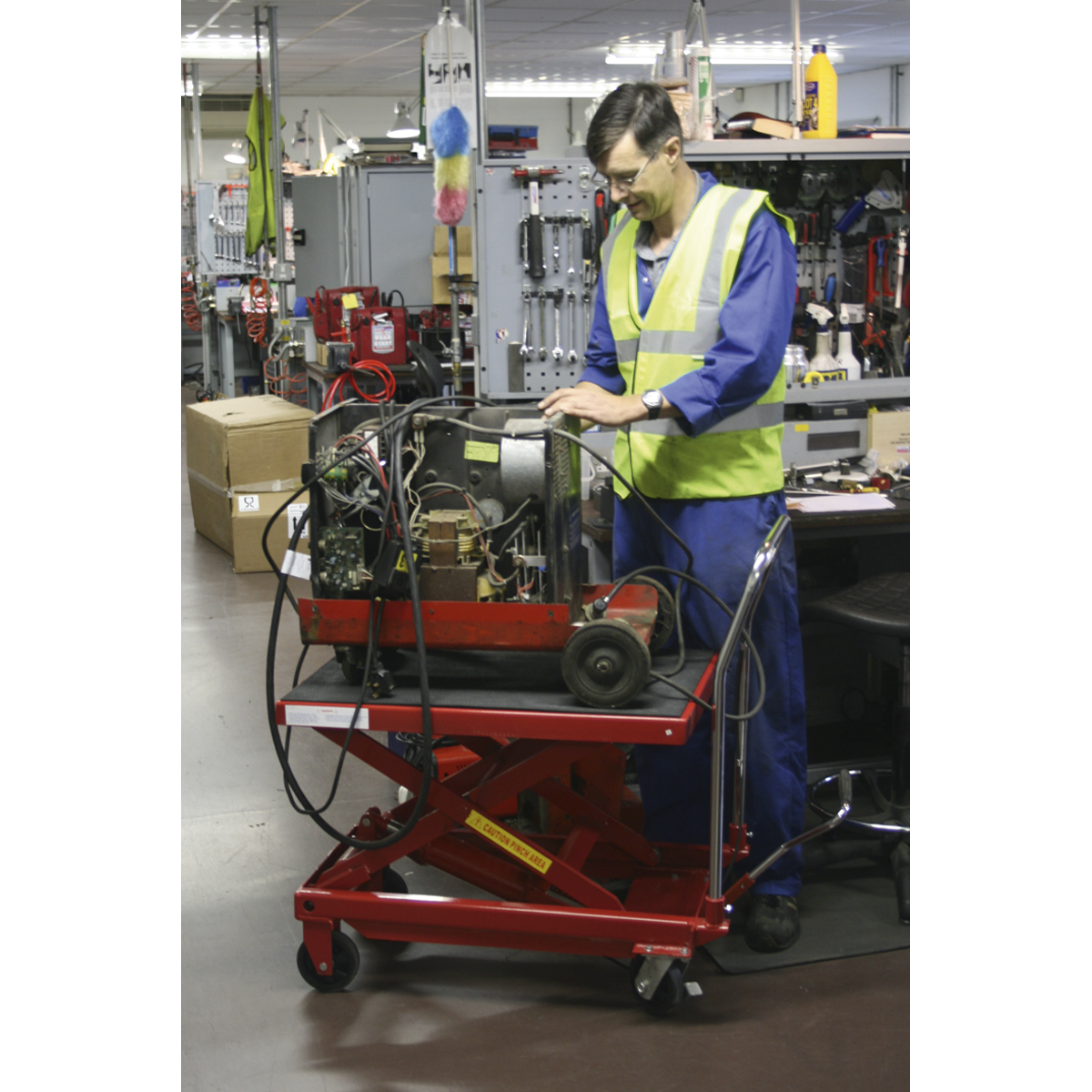 551.96 2025-12-28Heavy-duty construction. Fitted with four composite wheels, two fixed and two locking castor, for easy-rolling over rough workshop and warehouse floors. One-piece hydraulic unit controlled by large rear mounted foot pedal. Safety release mechanism positioned on handlebar for smooth controlled descent. Suitable for numerous garage, industrial and warehouse applications. Supplied with non-slip platform cover for added load security. May also be used as a mobile service bench.