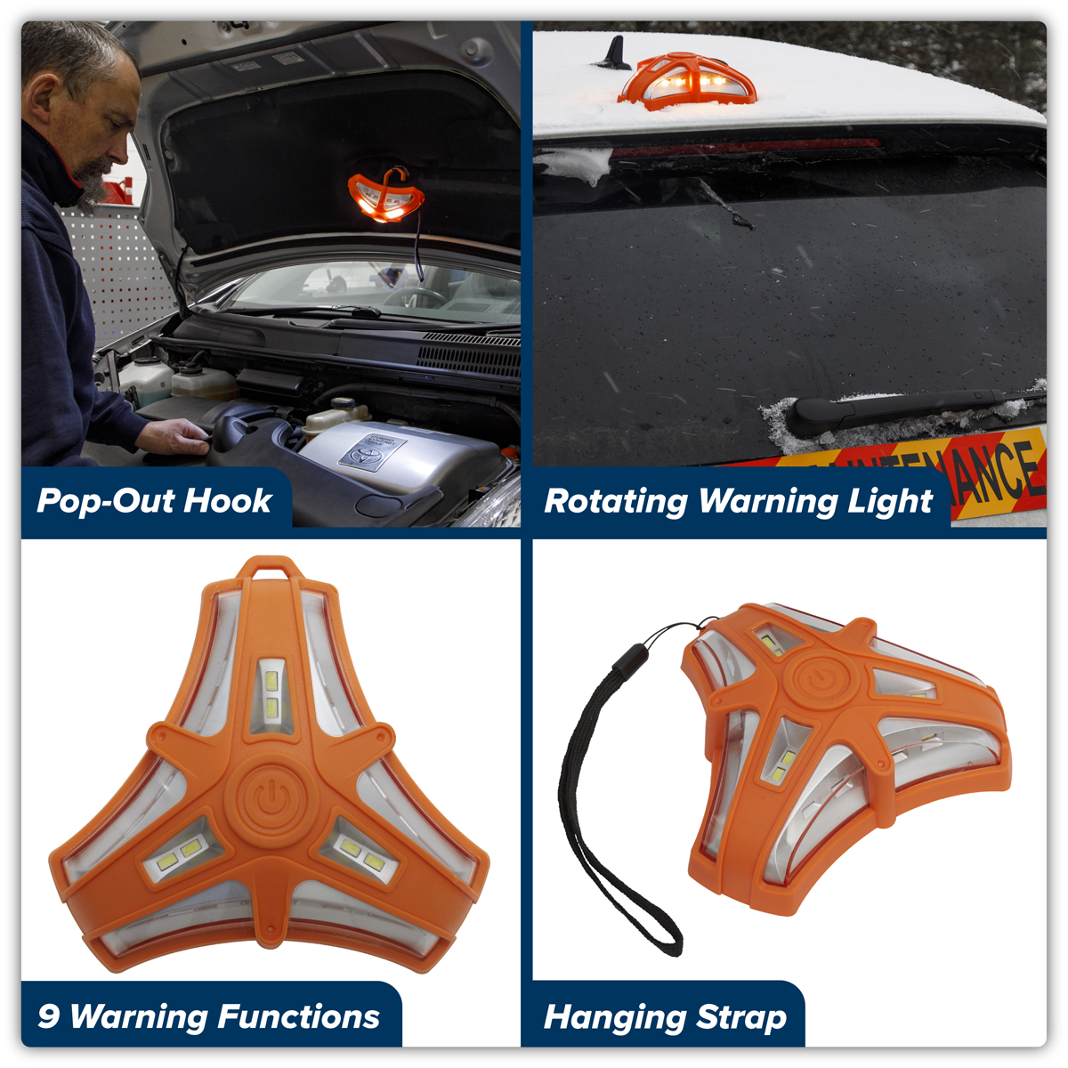 14.36 2025-11-02Rotating warning light is ideal to keep in the car for a variety of roadside emergency applications and hazard awareness. Durable, waterproof (IPX5) and extremely heavy-duty design. Features nine different warning functions with 12 ultra-bright amber coloured SMD LEDs and three white SMDs for use as a torch producing 150 lumens. Visible 360° at 500m distance. Includes three magnets for adhering to any ferrous material and hanging hook for hands-free operation. Powered by 3 x AAA batteries (not included).
