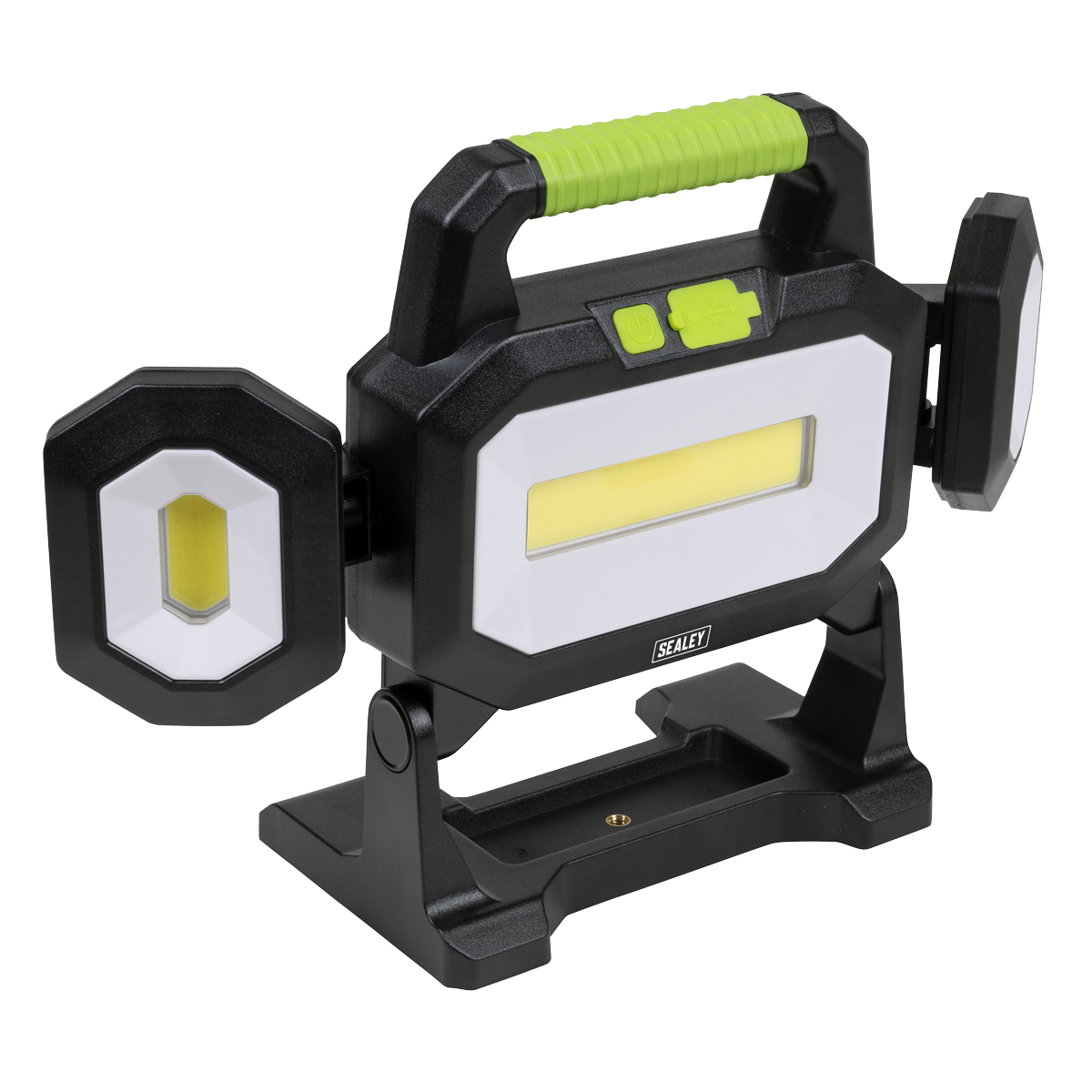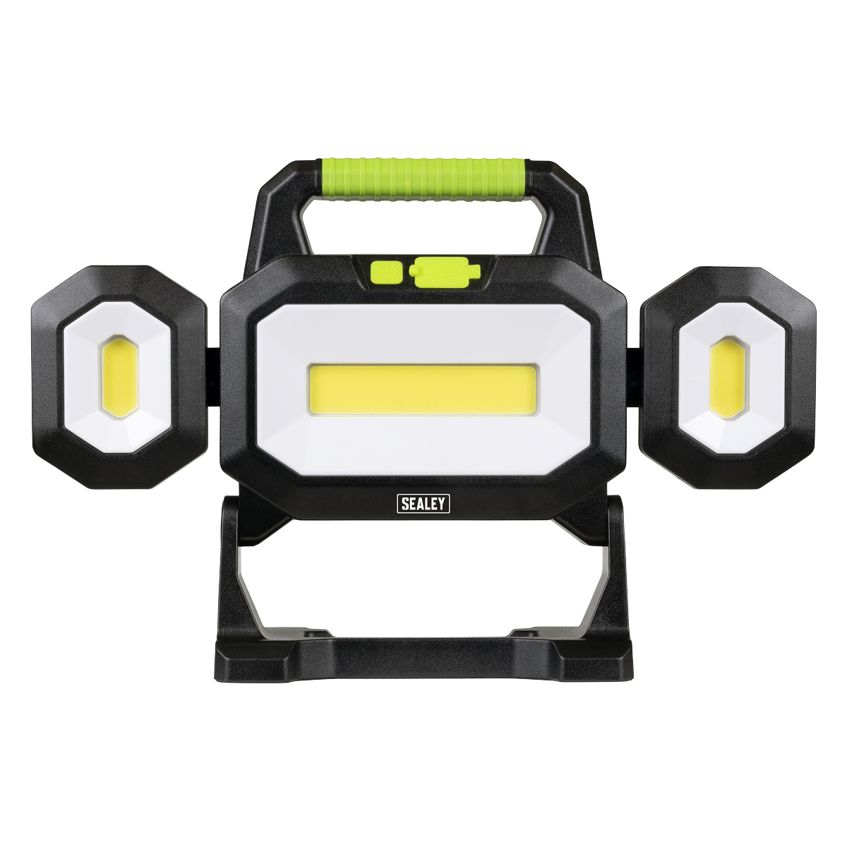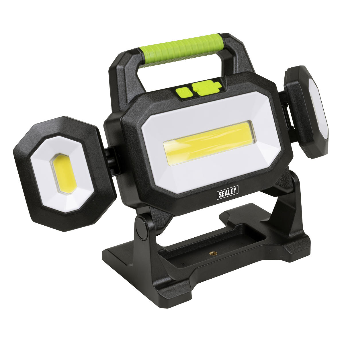 43.40 2026-05-2131W COB LED front light produces 2000 Lumens, and two side lights produce 1500 Lumens from 26W COB LEDs. Max. total output is 40W 3000 Lumen with all lights on. Main light can be rotated 180°, whilst the side lights can be positioned independently in any direction, to provide light precisely where required. Features three light modes. The main light can be operated independently from the side lights, or all lights can be activated simultaneously. 7.4V 4.4Ah Lithium battery charges via a USB Type-C charging port (USB cable supplied). Features magnetic base, large carry handle and is supplied with M6 screw adaptor to fit Sealey Telescopic Tripod, Model No. TRI01.