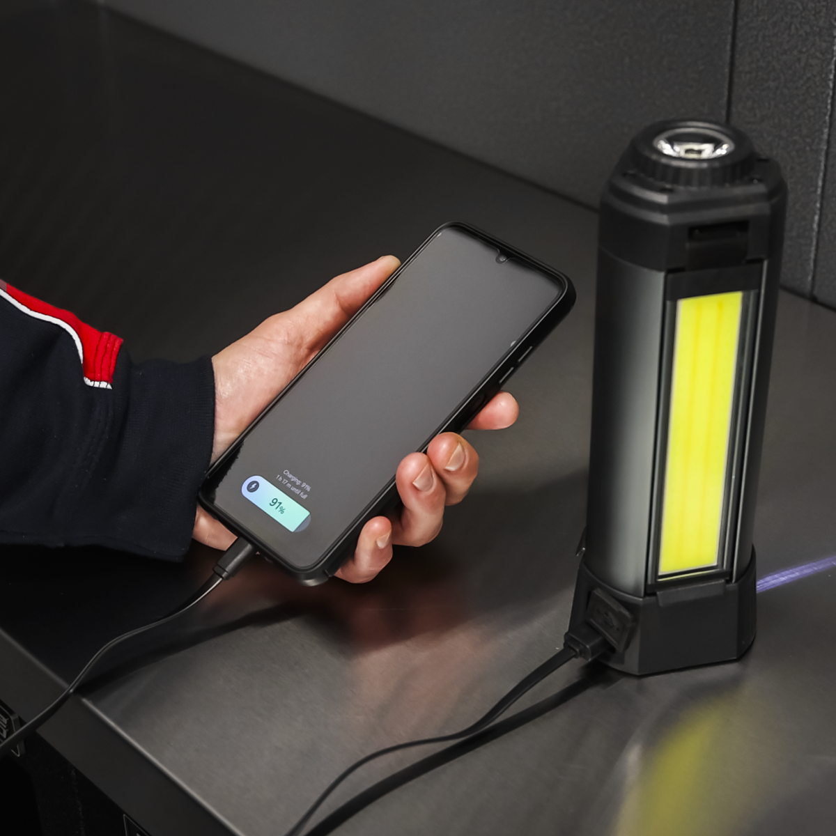 53.48 2026-04-16Three super bright 8W COB LED panels produce up to 2000 lumens and a smaller 5W SMD LED spotlight produces 400 lumens. Folding LED panels create a 360° spread of light or rotate and tilt to create a focused beam of light. Mounted on a 1.1m tripod for simple positioning of light and hands-free operation. Built-in power bank with 5V⎓1A USB output for providing power on the go. Features a magnetic base and hook which provide more mounting options. 3.7V 4Ah lithium-ion battery for extended battery life with a long run time of 4hr. Easy to read charge indicator displays the current battery level during use and while charging. Charges via USB Type-C cable (supplied).