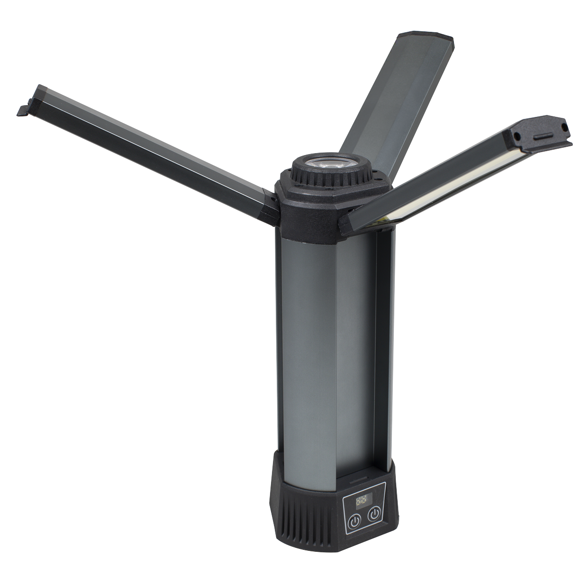 47.96 2025-11-01Three super bright 8W COB LED panels produce up to 2000 lumens and a smaller 5W SMD LED spotlight produces 400 lumens. Folding LED panels create a 360° spread of light or rotate and tilt to create a focused beam of light. Mounted on a 1.1m tripod for simple positioning of light and hands-free operation. Built-in power bank with 5V⎓1A USB output for providing power on the go. Features a magnetic base and hook which provide more mounting options. 3.7V 4Ah lithium-ion battery for extended battery life with a long run time of 4hr. Easy to read charge indicator displays the current battery level during use and while charging. Charges via USB Type-C cable (supplied).