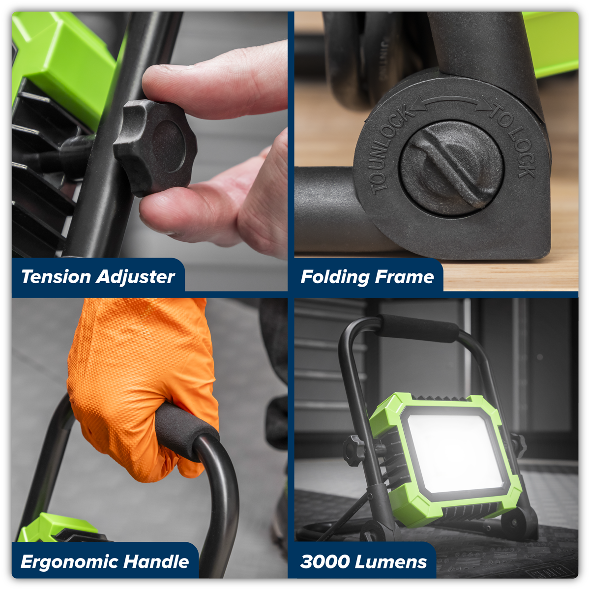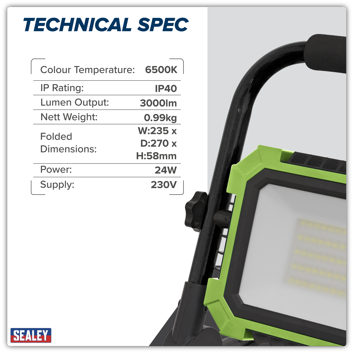 32.95 2025-11-01Portable floodlight with adjustable stand. 24W SMD LED worklight producing up to 3000 lumens. Tension adjuster on both sides of hinge to fix frame at desired angle. Light angle separately adjustable within frame. Durable folding frame makes for easy storage - collapsed size: 235 x 270 x 58mm. Simple on/off switch on reverse of light. 1.9m Cable supplied with 3-pin plug.