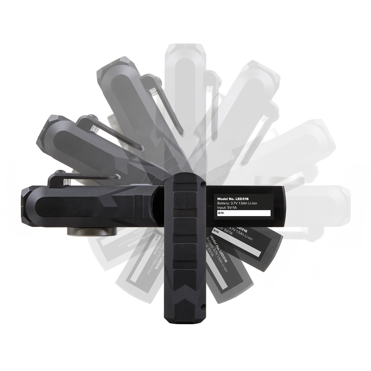 17.84 2026-01-035W COB LED directional light, 3W SMD LED front torch, 3W COB LED front strip lighting and strobe effect. Also featuring 180° rotational stand, magnet, hook and clip for multiple uses. Supplied with Micro USB charging lead. Maximum of 300 lumens and 2.5hr runtime. Li-ion battery with charge indicator.