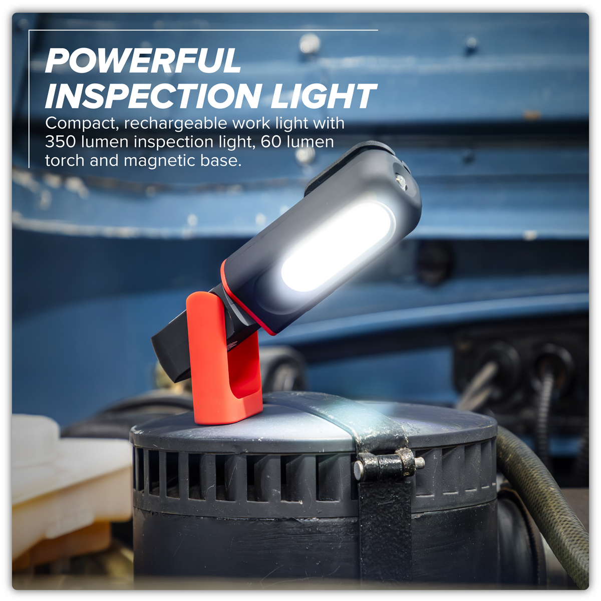 18.74 2026-02-13Features a super bright 3W COB LED light producing 350lm which gives an even and constant spread of light. Light body twists 360° and light arm tilts 180° to provide light at any angle required. Inspection light will cycle through three modes: 30% front light, 100% front light, top light. Includes a built in magnetic base for hands free operation. Light also features a hanging hook and a built in belt clip. Rechargeable 3.7V 1.2Ah lithium-ion battery for longer life, no memory effect and a much slower discharge than traditional Ni-MH batteries. Charges via a USB Type-C cable (supplied).