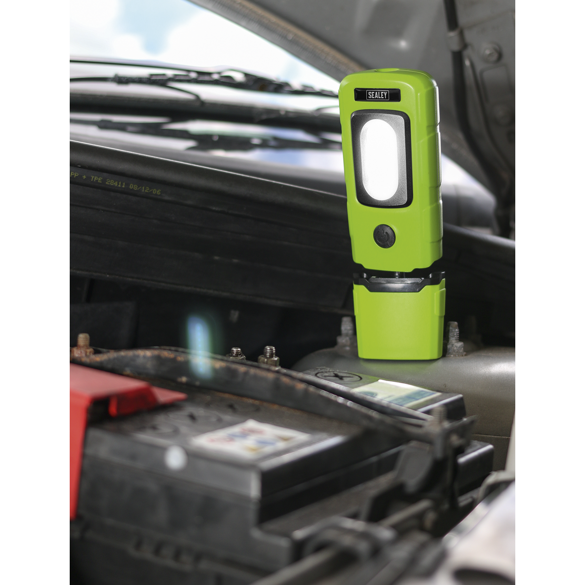 35.36 2025-12-21Mini, lightweight light with exclusive patented design owned by and registered to Sealey. Unique and innovative 360° swivel and tilt function enables the light source to be positioned in any direction. Featuring a super bright 3W COB LED light source, which gives an even and constant spread of light. Produces up to 300 lumens with a CRI-80 rating. Recessed lens for added protection. 1W High power SMD LED directional torch located on top of the light, produces up to 100 lumens. Rubber covered magnet in base and swivel hook for hands-free operation. High quality rechargeable 3.7V 1.5Ah Lithium-Polymer battery for longer life. Supplied with Micro USB cable.