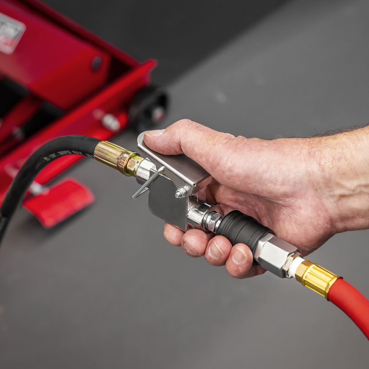 1079.95 2026-03-15All steel construction with air pump or foot pedal for manual operation. Integral hydraulic pump and air motor assembly. Air Consumption 7.06cfm. Fitted with platform auto safety lock device to fix the platform at three working heights of 470/560/650mm to prevent accidental lowering. Front wheel clamp for stability and sliding panel for easy rear wheel removal. Support platform fitted with full width loading ramp. Base assembly fitted with transport wheels and lock-downs to prevent lift from moving during use. Suitable for use with centre-stand motorcycles or with paddock stand.
