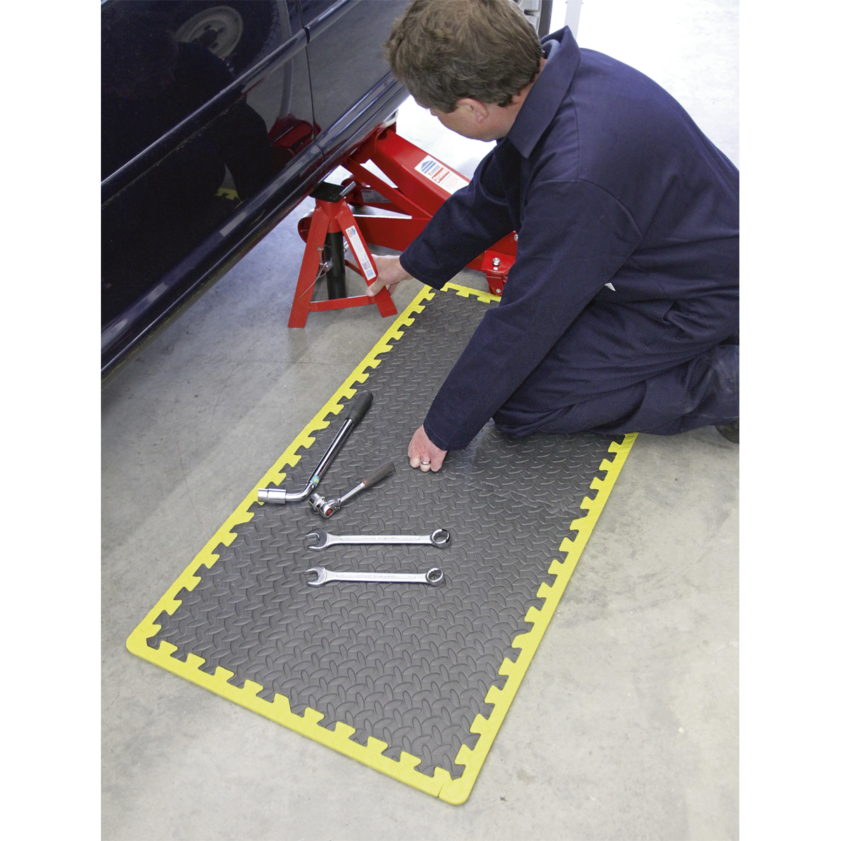 47.00 2025-12-22Hard-wearing EVA foam anti-slip matting suitable for use in the workshop and machine room. Provides fatigue relief and insulation from cold concrete floors. All tiles can be interlocked to make one bordered area, alternatively can be laid out as three separate bordered areas of two tiles each. The hi-vis border increases visibility, improving safety.