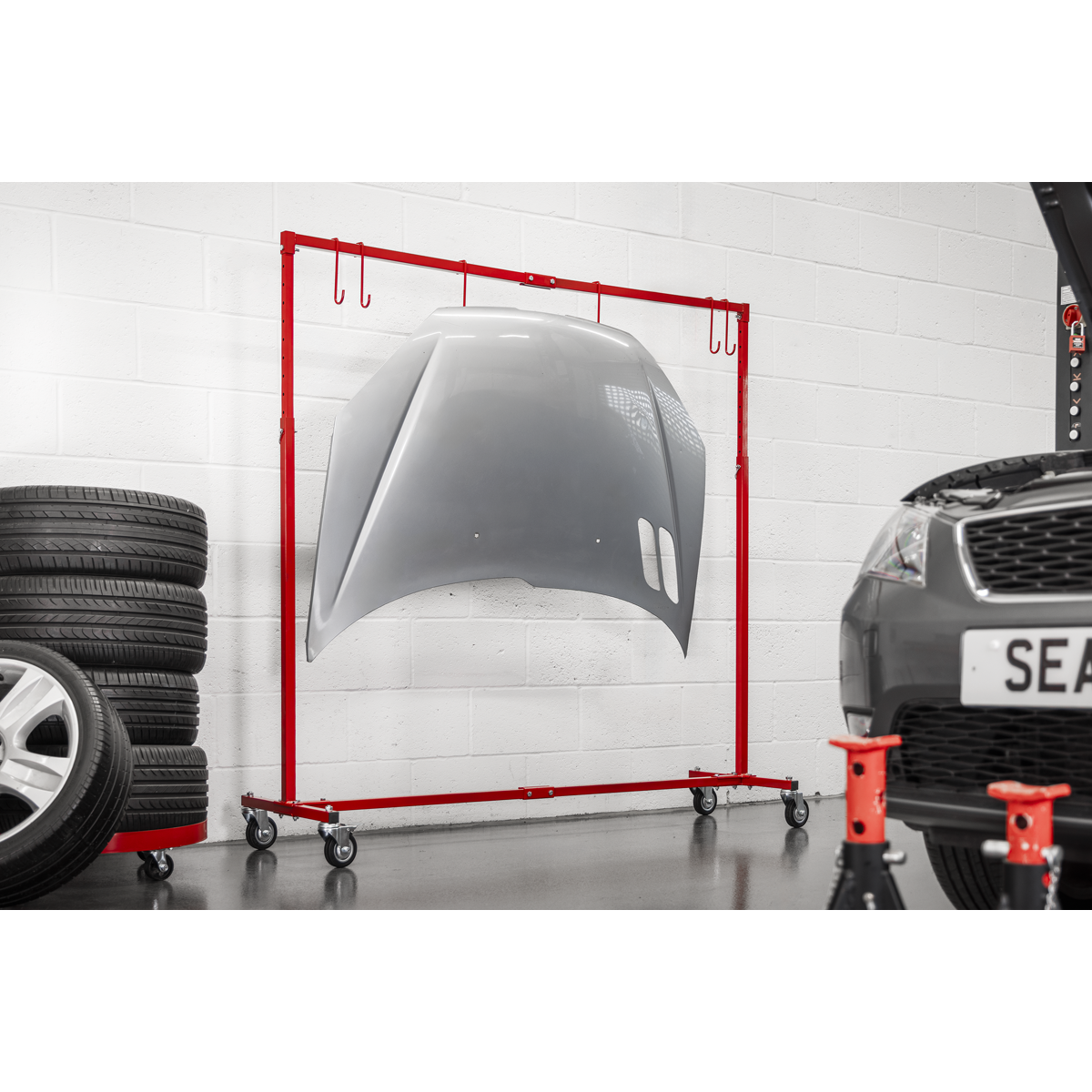 118.76 2025-12-12Adjustable height from 1.3m to 1.95m. Six hooks with a combined capacity of 75kg for hanging small parts. Suitable for hanging bumpers, bonnets, doors, wings and spoilers. Fitted with four castors, two with brakes for maximum manoeuvrability and safe positioning.