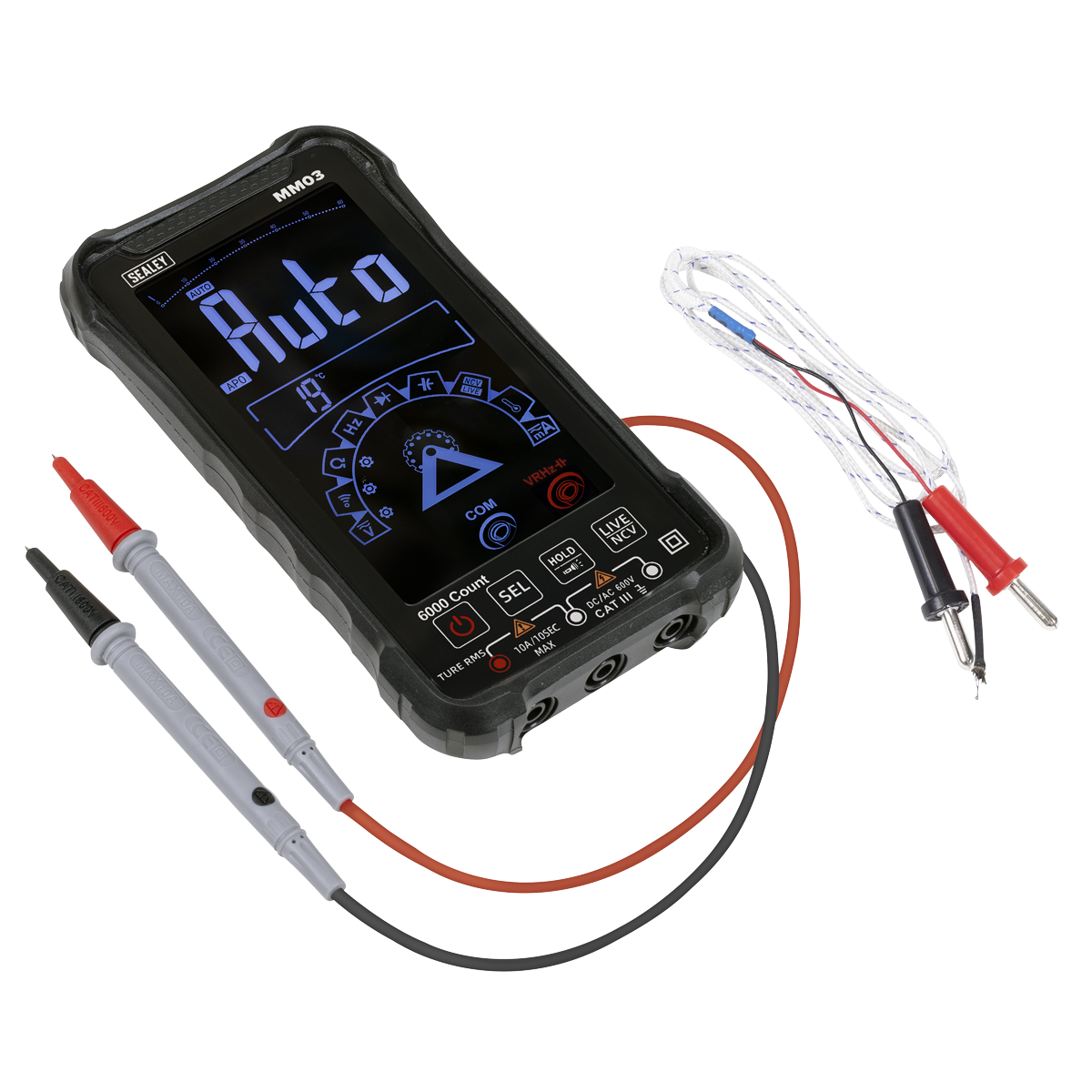 34.76 2026-01-03Intelligent multimeter automatically detects and selects the required test function, AC/DC, voltage/current, resistance and continuity. Features temperature measurement capability, data-hold and auto-power-off function. Non-contact voltage detection (NCVD) enables one-handed use. 6000 Count high precision measurements. Live test feature can test for live feeds with a single probe. Large LCD touchscreen and LED worklight. Rechargeable, supplied with USB Type-C charging cable. Includes probes and thermocouple probe. High-impact case. Supplied in a storage case. Conforms to EN 61010-2 CATIII 600V safety requirements for electrical equipment for measurement, control and laboratory use.