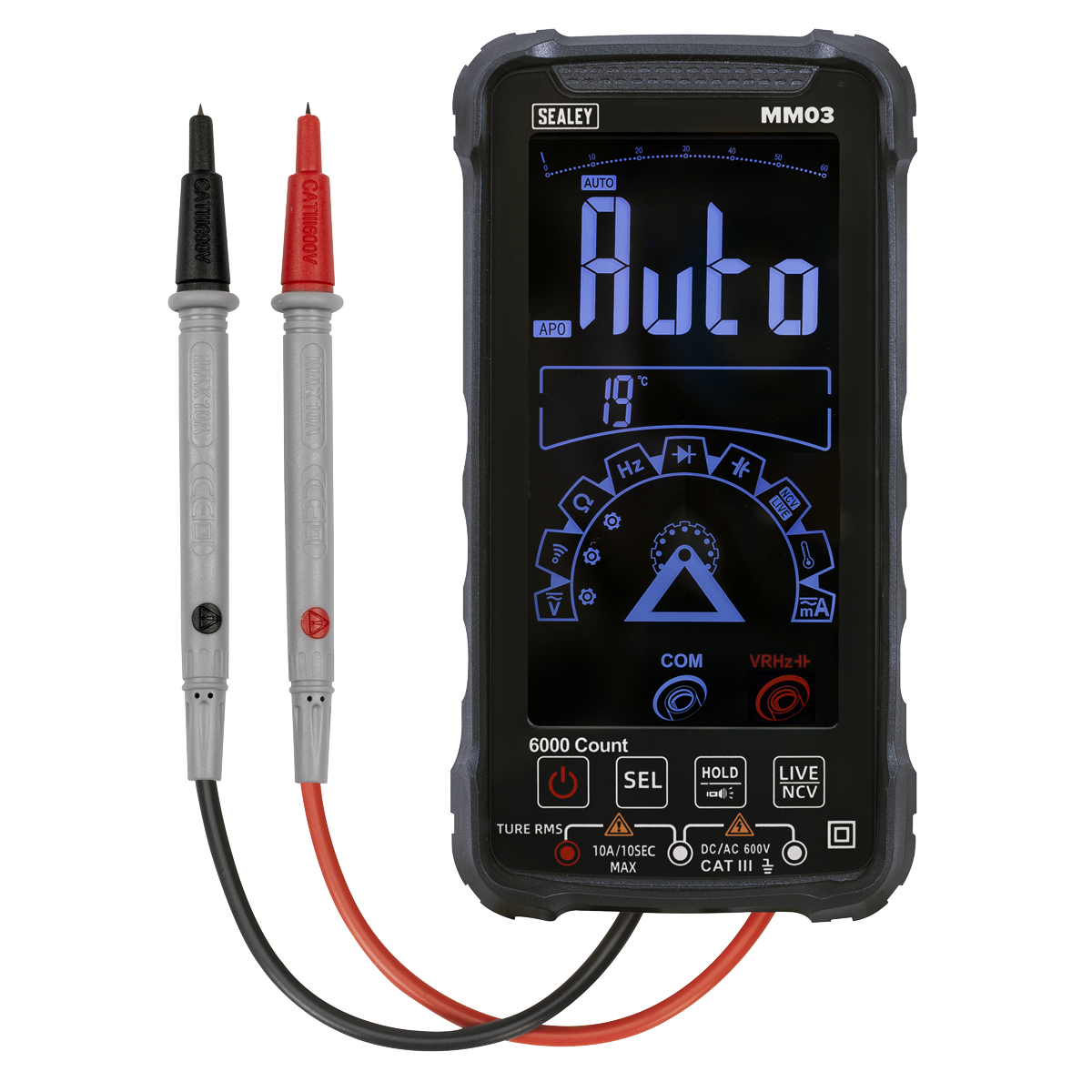34.76 2025-11-01Intelligent multimeter automatically detects and selects the required test function, AC/DC, voltage/current, resistance and continuity. Features temperature measurement capability, data-hold and auto-power-off function. Non-contact voltage detection (NCVD) enables one-handed use. 6000 Count high precision measurements. Live test feature can test for live feeds with a single probe. Large LCD touchscreen and LED worklight. Rechargeable, supplied with Type-C USB charging cable. Includes probes and thermocouple probe. High-impact case. Supplied in a storage case. Conforms to EN 61010-2 CATIII 600V safety requirements for electrical equipment for measurement, control and laboratory use.