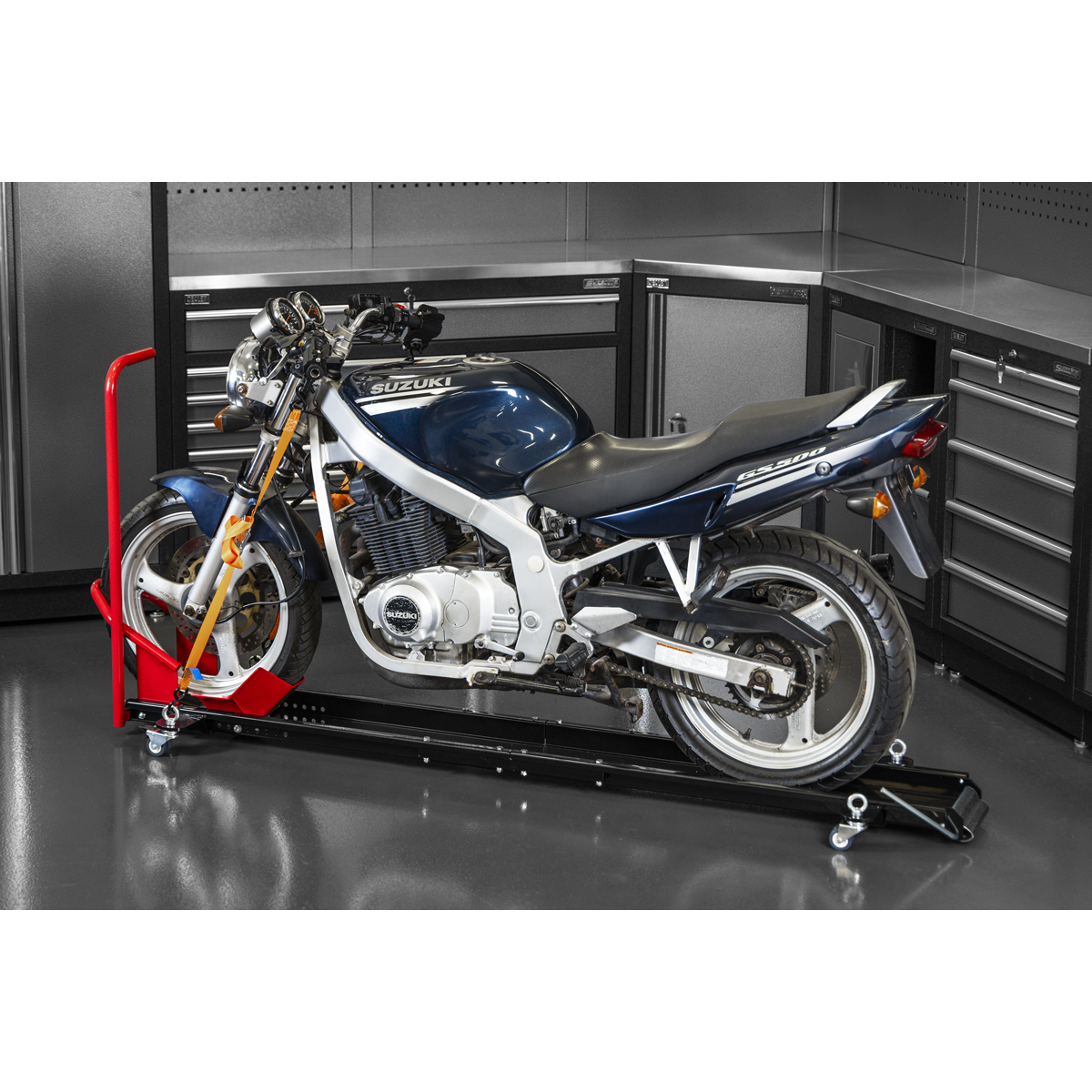 242.96 2026-03-15Motorcycle dolly supports a single motorcycle upright by the front wheel, with a maximum weight capacity of 500kg. Allows for quick and efficient repositioning within the workshop or garage. Rear lever-operated wedge gate facilitates easy loading and unloading. Includes a front clamp to secure the motorcycle during transportation. Glides smoothly on dual-wheeled 360° castors.