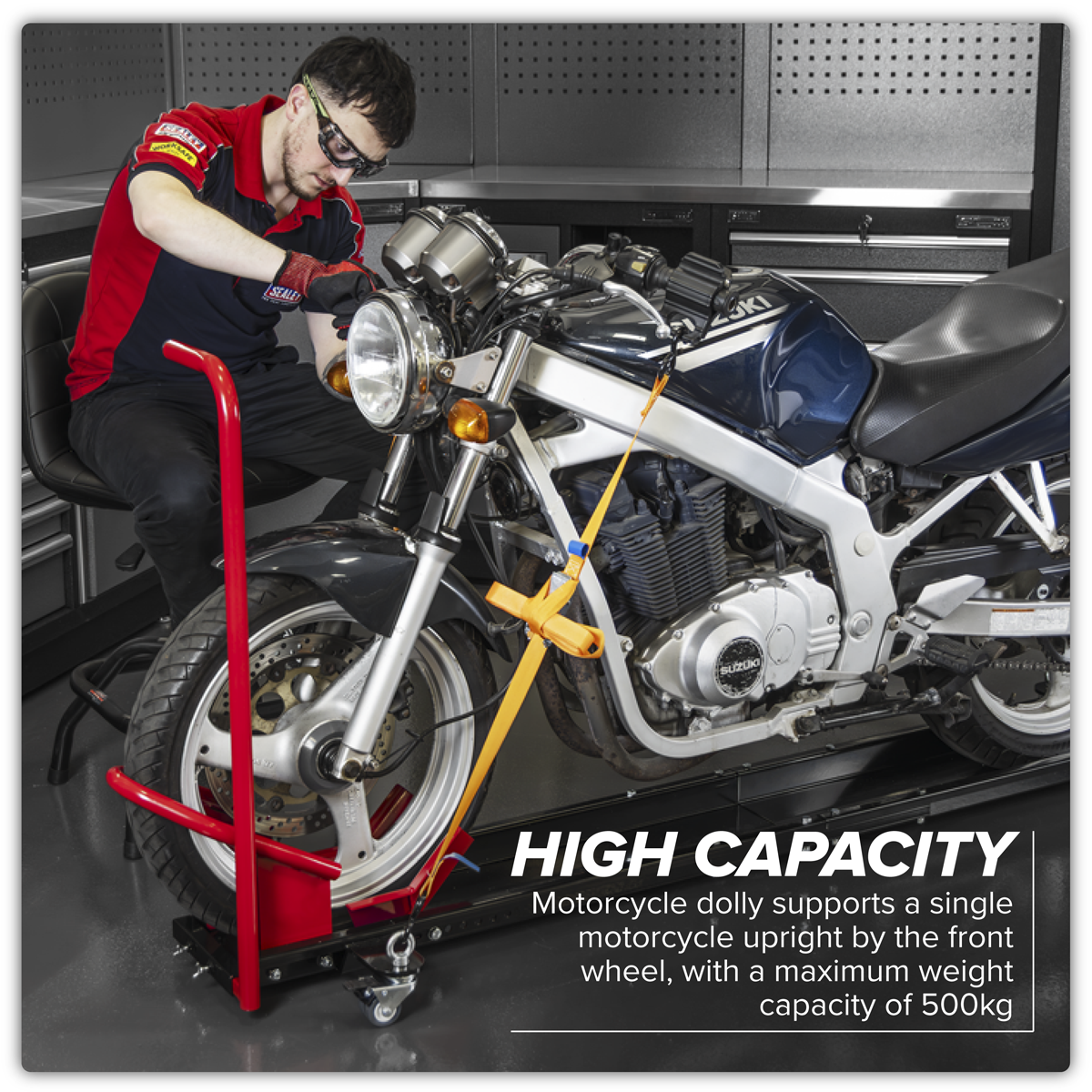 242.96 2026-04-04Motorcycle dolly supports a single motorcycle upright by the front wheel, with a maximum weight capacity of 500kg. Allows for quick and efficient repositioning within the workshop or garage. Rear lever-operated wedge gate facilitates easy loading and unloading. Includes a front clamp to secure the motorcycle during transportation. Glides smoothly on dual-wheeled 360° castors.
