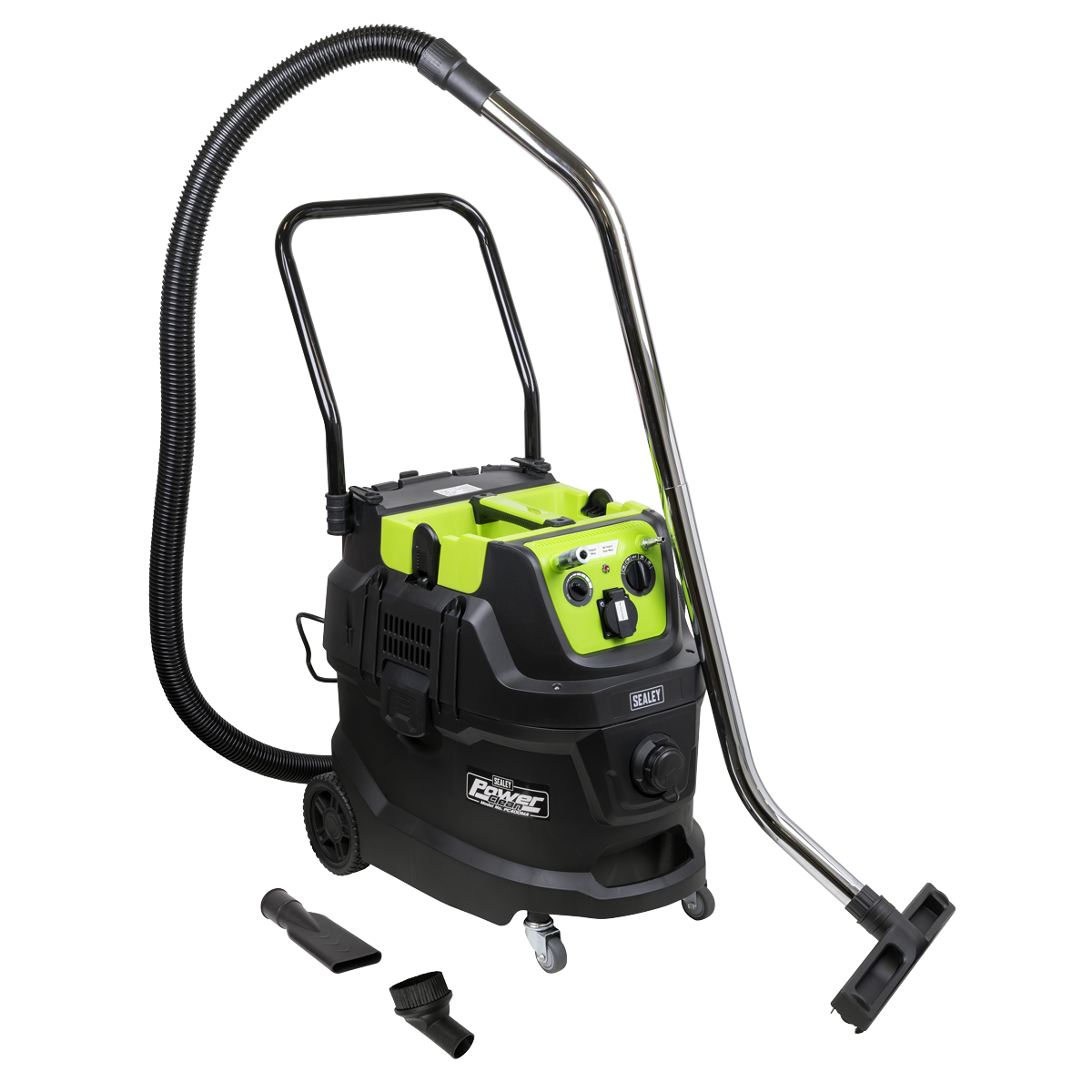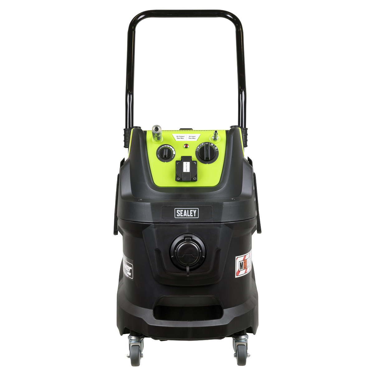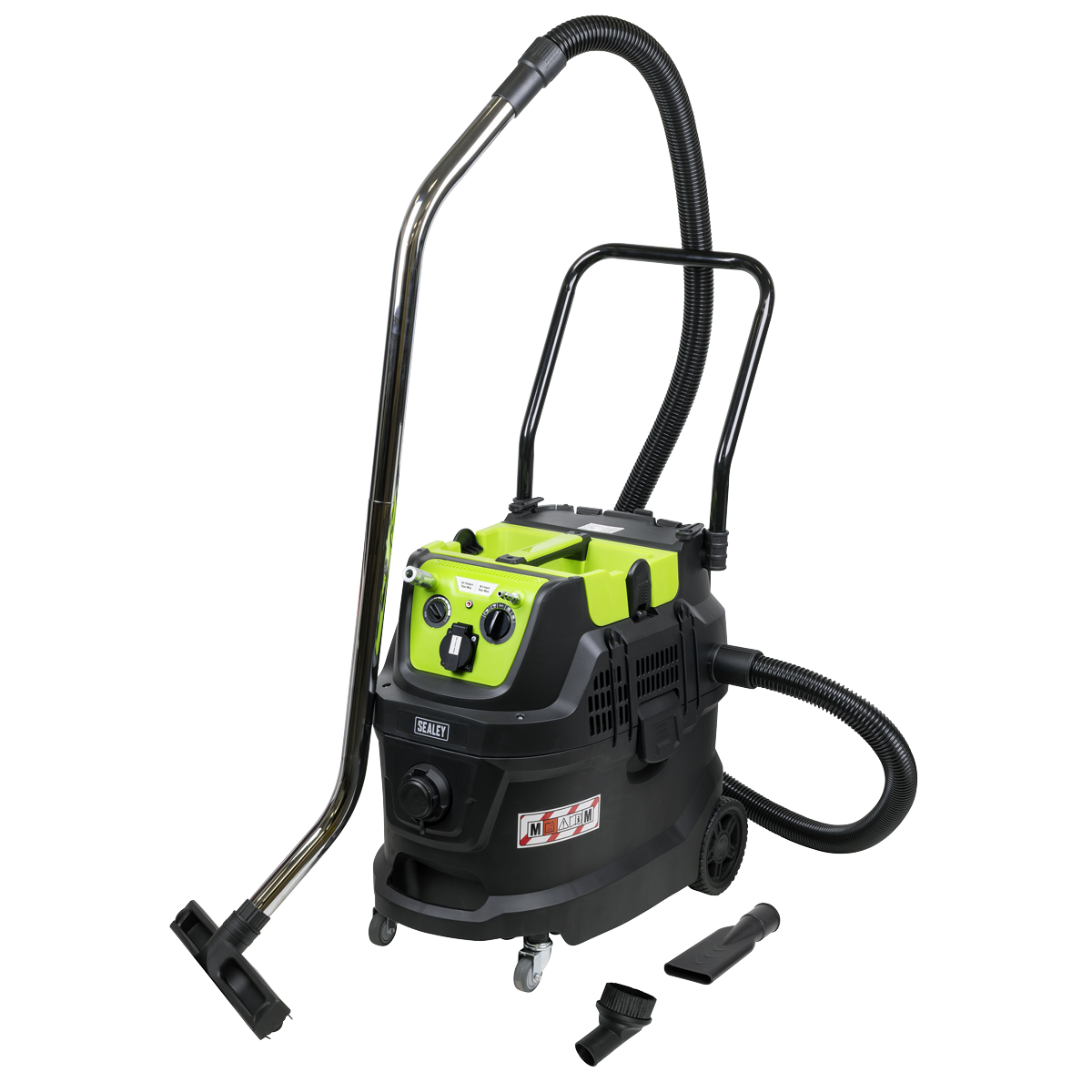 332.36 2025-11-14Certified for M Class extraction which filters particles down to 1 micron, minimising exposure and keeps potentially harmful dust particles safely contained. Features a 1400W 3-pin power outlet and two quick release air fittings. These can be used to automatically turn the vacuum on/off when a power tool is turned on/off. Fitted with a shut-off valve and sponge filter for vacuuming liquid or HEPA filter for dry vacuuming. Self-Cleaning function reverses the airflow to effectively clean the filter and restore suction. This also means the vacuum can be used as a blower. Fitted with 5m cable and 2.5m suction hose. Supplied with two stainless steel extension tubes, washable M Class HEPA filter, M Class dust bag, foam filter, floor brush, round brush and crevice tool. Equipped with fixed rear wheels and two swivel castors for easy manoeuvrability.